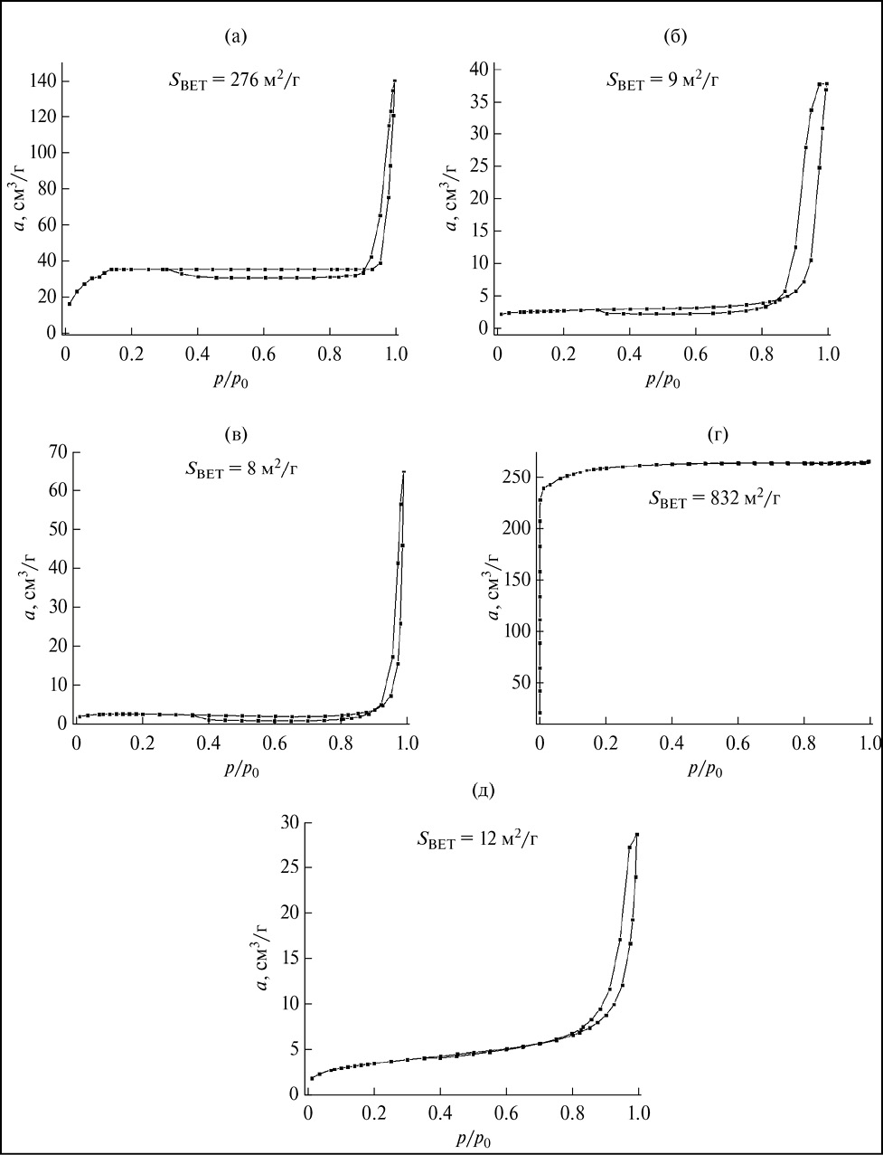 Рис. 1. Изотермы низкотемпературной адсорбции азота образцами сорбентов: а) CoBTC, б) NiBTC, в) NiBDC, г) CuBTC, д) CuBDC