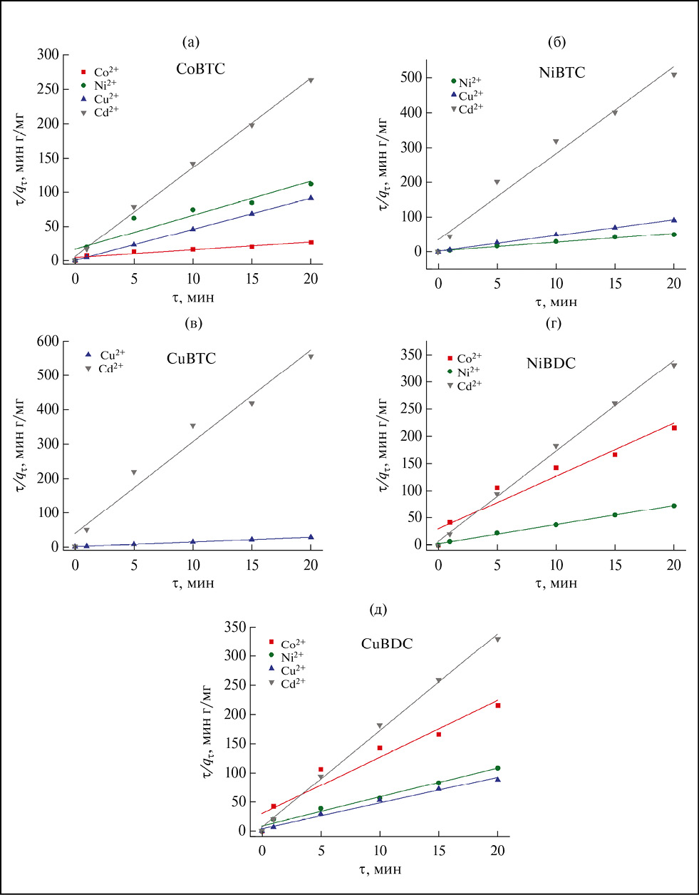 Величина константы скорости псевдовторого порядка для адсорбции ионов таких металлов, как Co2+, Ni2+, Cu2+, а также Cd2+, на образцах CoBTC, NiBTC, CuBTC, NiBDC и CuBDC, свидетельствует о высокой эффективности процесса. Коэффициенты достоверности аппроксимации для рассматриваемых соединений имеют высокие значения (табл. 2), что свидетельствует о надежности полученных результатов и их соответствии рассматриваемой модели.