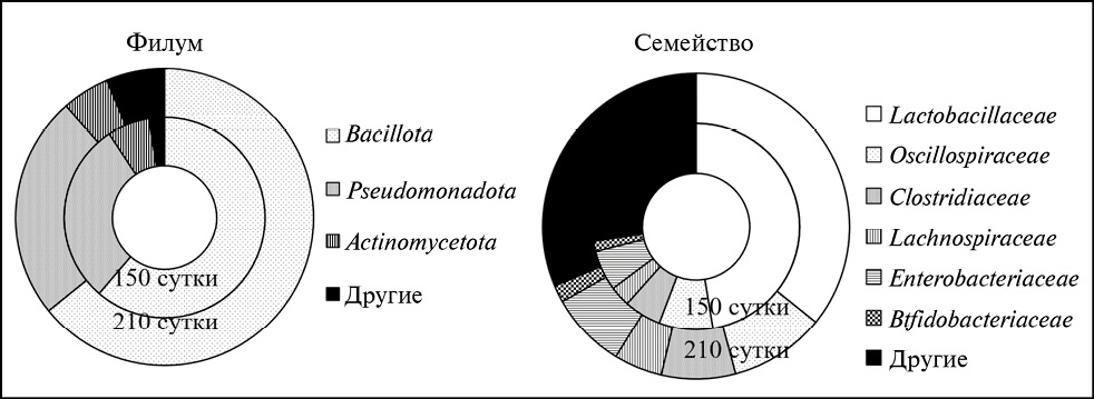 В нашем эксперименте на 210-е сутки, по сравнению со 150-ми сутками, при внесении Дигестарома на фоне снижения численности бактерий семейства Lactobacillaceae отмечено увеличение численности представителей семейства Bifidobacteriaceae, Lachnospiraceae, Ruminococcaceae. Известно, что добавки растительных экстрактов, к которым относится и препарат Дигестаром, улучшают показатели роста, усвояемость питательных веществ, эффективность корма и состояние микробиома кишечника домашней птицы, в том числе благодаря изменению качественного и количественного состава микробиоты желудочно-кишечного тракта [45].