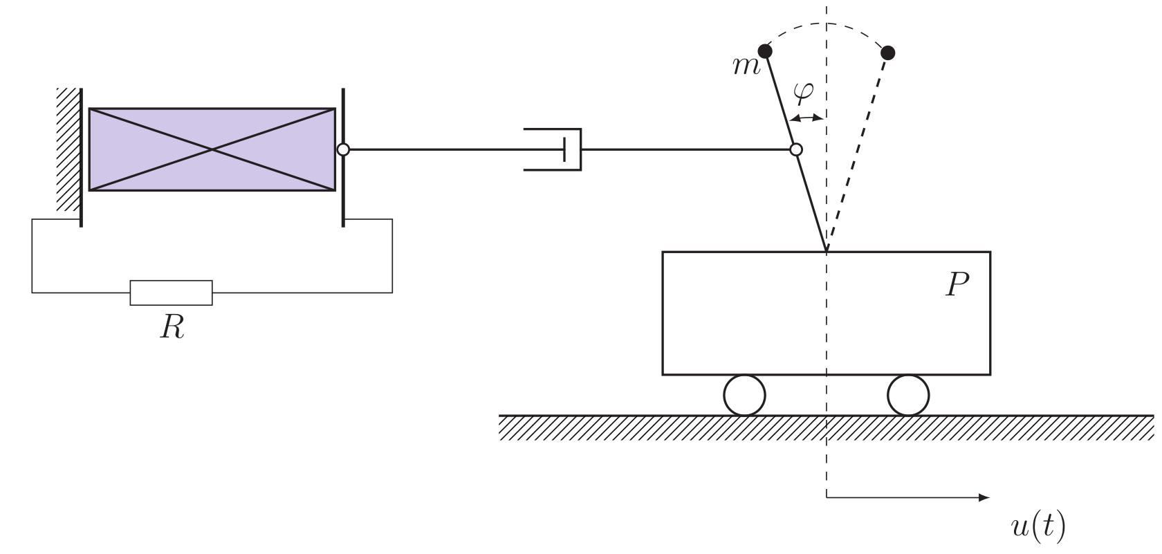 Платформа P может перемещаться в горизонтальном направлении. Угол отклонения маятника относительно вертикали равен φ(t), координата платформы — u(t). Длина маятника равна l, масса его груза равна m.