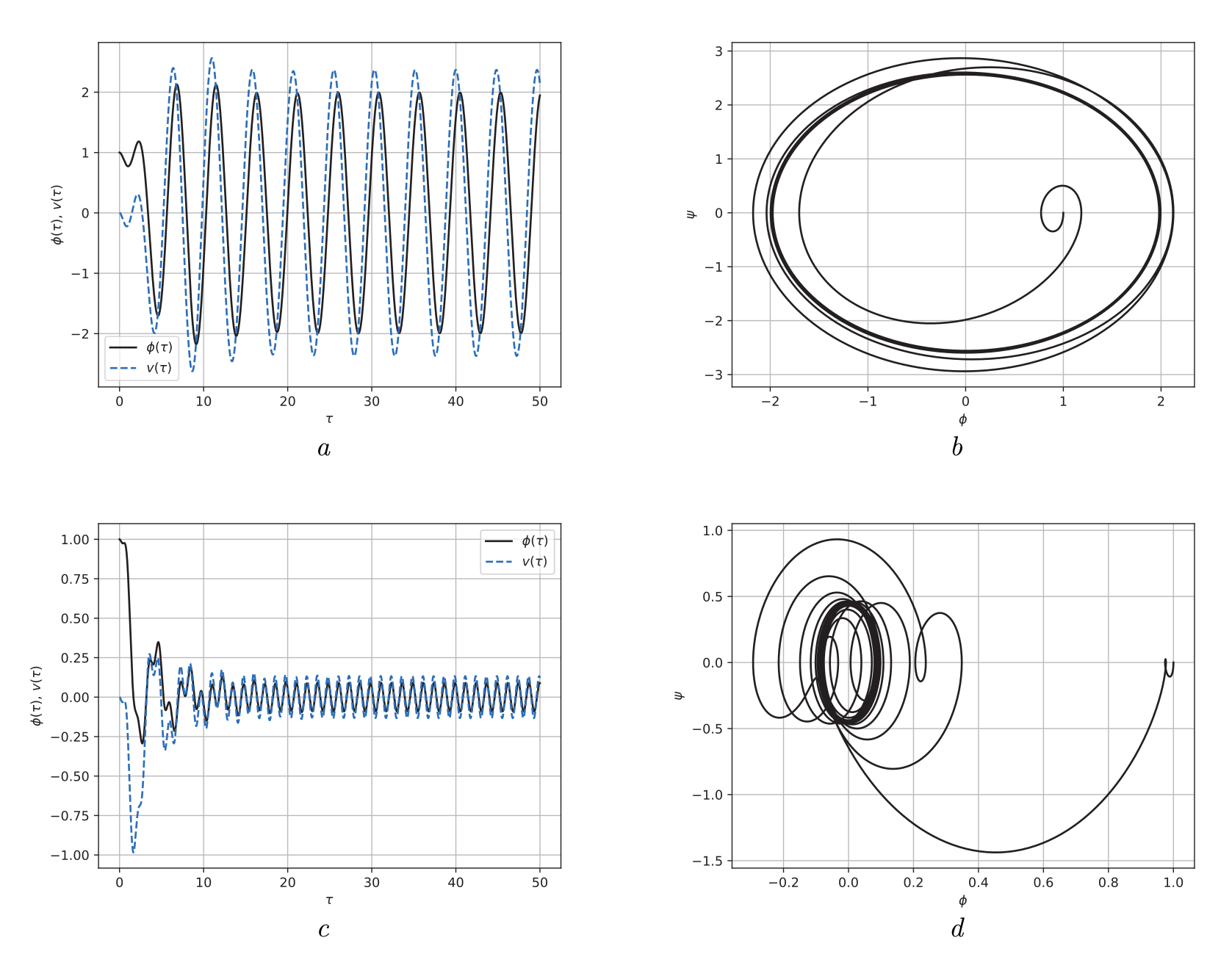 Рис. 1.4. Зависимость динамических переменных от безразмерного времени и фазовые портреты в условиях отсутствия гистерезисного слагаемого. Значения параметров σ = 1.5, ω = 1.2, K = 2.0, H = 0. Начальные условия φ(0) = 1, ψ(0) = 0, σ(0) = 0: a — угол отклонения маятника φ(τ) и напряжение v(τ), Ω = 1.3; b — фазовый портрет колебаний маятника ψ(φ) при Ω = 1.3; c — угол отклонения маятника φ(τ) и напряжение v(τ), Ω = 5.0; d — фазовый портрет колебаний маятника ψ(φ) при Ω = 5.0