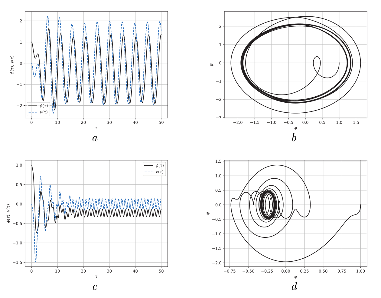 Рис. 1.5. Зависимость динамических переменных от безразмерного времени и фазовые портреты при H = 0.5. Значения параметров σ = 1.5, ω = 1.2, K = 2.0. Начальные условия φ(0) = 1, ψ(0) = 0, σ(0) = 0: a — угол отклонения маятника φ(τ) и напряжение v(τ) при Ω = 1.3; b — фазовый портрет колебаний маятника ψ(φ) при Ω = 1.3; c — угол отклонения маятника φ(τ) и напряжение v(τ) при Ω = 5.0; d — фазовый портрет колебаний маятника ψ(φ) при Ω = 5.0