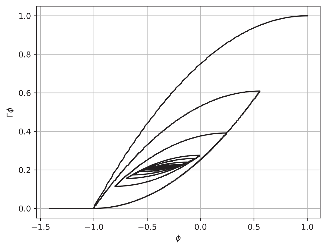На рис. 1.8 представлена гистерезисная кривая в координатах (φ, Γφ). Из рисунка видно, что после нескольких циклов колебаний достигается установивший режим.