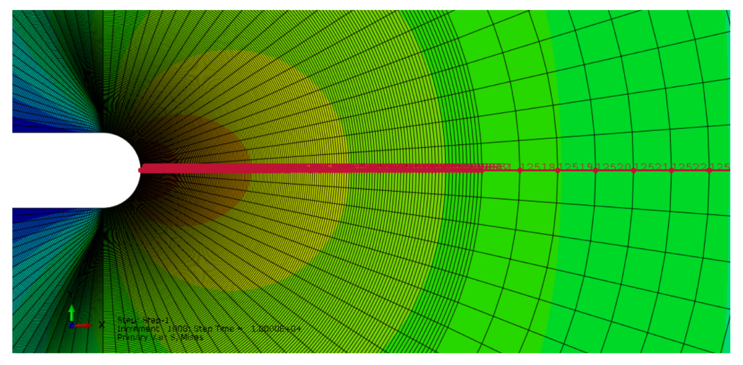 Сетка в окрестности вершины трещины построена с использованием сингулярных конечных элементов. Концентрические окружности поделены на три области: перед вершиной дуга окружности величиной разбита на 36 секторов, таким образом, раствор секторального элемента равен , две другие части поделены на 17 секторов. Тип элементов сетки был избран CPS4. Полученная конечно-элементная сетка представлена на рис. 4.