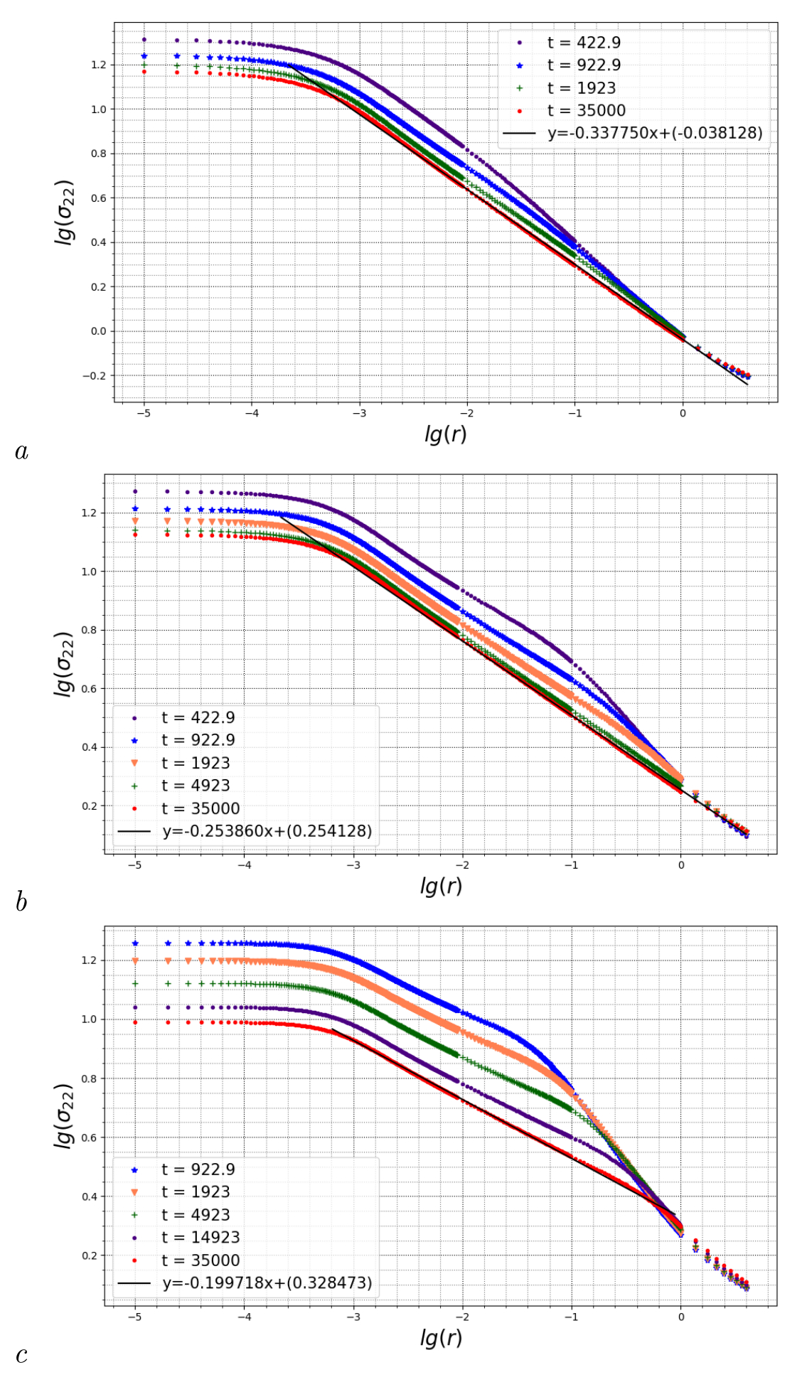 Для каждого графика построена регрессионная прямая, отмеченная на графиках черной линией, аппроксимирующая значения компоненты тензора напряжений в последний рассматриваемый момент времени в зоне ползучести. Полученные значения коэффициента наклона этой прямой существенно отличаются от значений, соответствующих формуле , а значит и асимптотике решения ХРР. Здесь также можно отметить, что в области, близкой к вершине закругленной трещины, асимптотика не наблюдается, в отличие от расчетов с острой трещиной. Результаты на рис. 7 отличаются от распределений, полученных на расчетах при действии ползучести без учета накопления поврежденности, как на рис. 7. По графикам на рис. 7 можно заметить, каким образом процесс накопления поврежденности изменяет асимптотику напряжений в окрестности вершины трещины.
