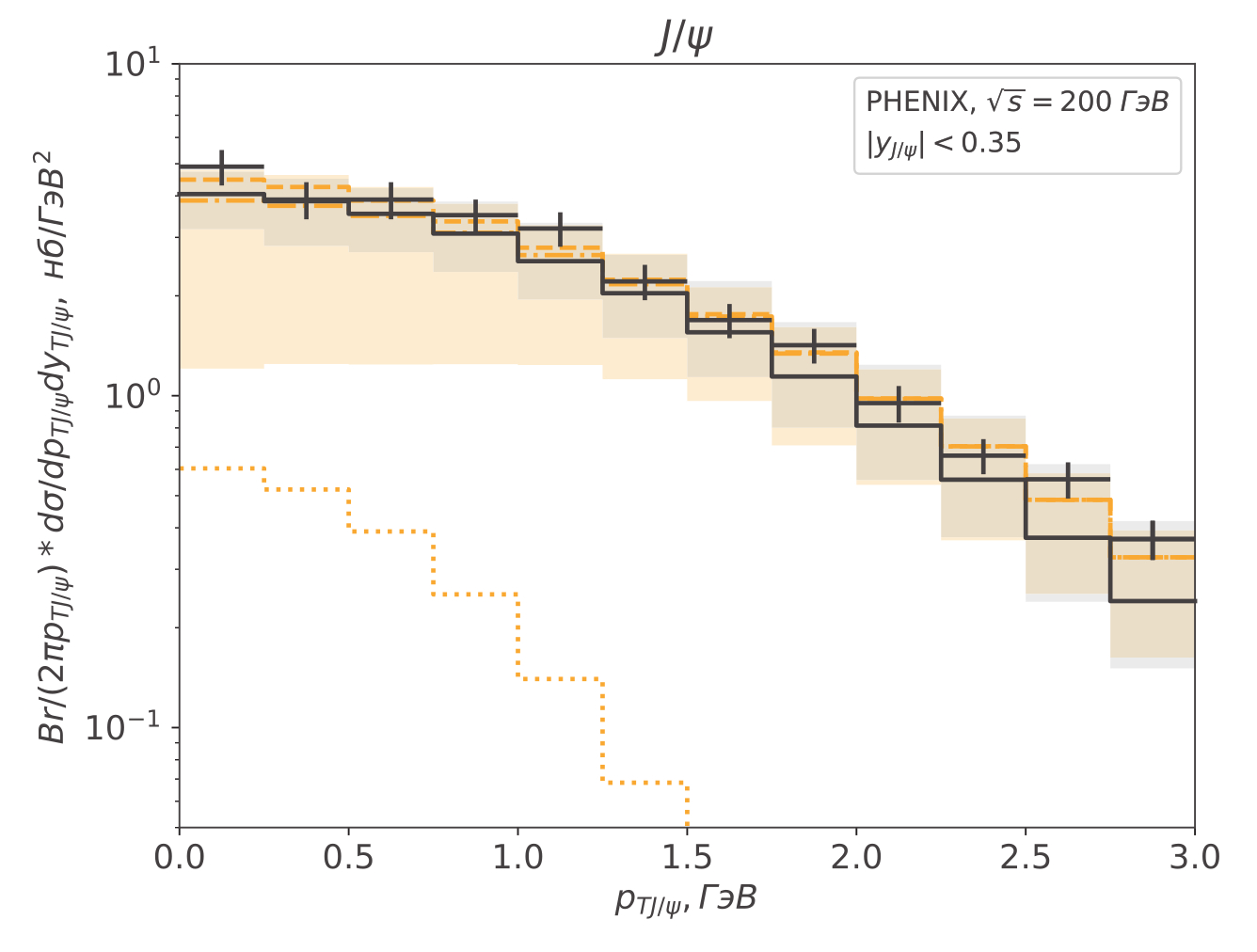 В работе [18] было показано, что экспериментальные данные коллаборации PHENIX [19] для спектра по поперечному импульсу прямых J/ψ -мезонов в области pT ≤ 1 GeV хорошо описываются в МЦС, и вклад октетных НМЭ должен быть малым. Как будет показано ниже, если фитировать экспериментальные данные по pT - спектрам прямых J/ψ - мезонов в области pT ≤ 3 ГэВ в МЦС и ОПМ, варьируя только параметр a в ПФР, можно получить хорошее согласие с экспериментом.