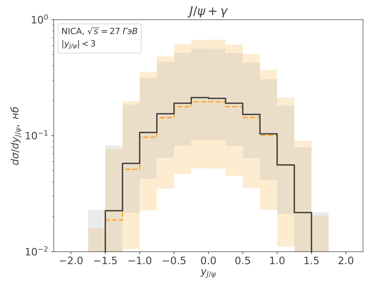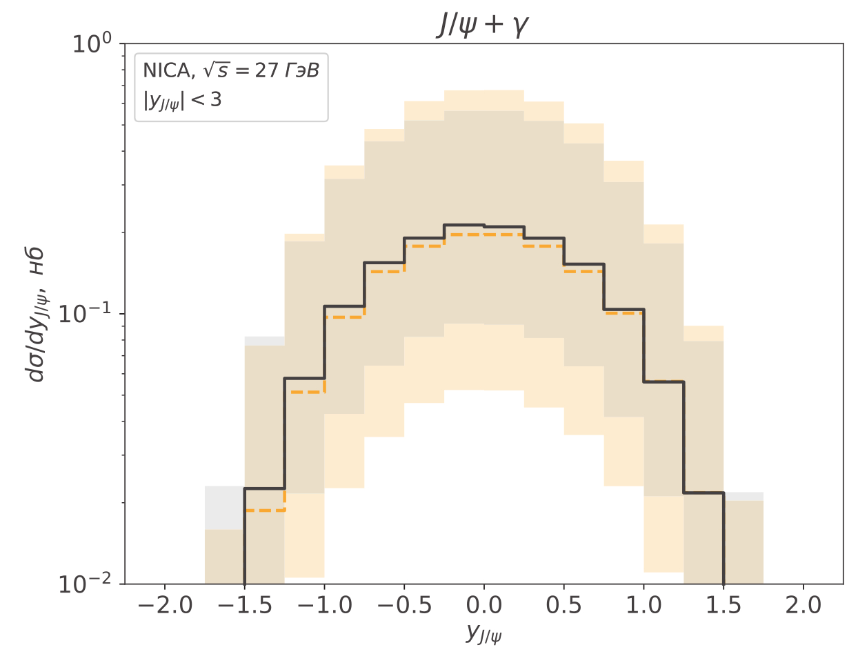 При энергиях коллайдера NICA проведен расчет дифференциальных сечений ассоциативного рождения J/ψ - мезонов и прямых фотонов в ОПМ и в рамках моделей адронизации МЦС и МИЦ. Параметры моделей были фиксированы из сравнения с экспериментальными данными по спектрам прямых J/ψ -мезонов при энергиях экспериментов PHENIX [42] и NA3 [43]. Рассчитанные спектры для ассоциативного рождения J/ψ+γ слабо зависят от выбора модели адронизации, МЦС или МИЦ. Основная погрешность теоретических расчетов, как это обычно наблюдается в расчетах в ЛП по константе сильного взаимодействия, обусловлена неопределенностью в выборе жесткого масштаба и может достигать 100 %. Однако предсказываемые нами величины сечения ассоциативного рождения J/ψ+γ при энергии эксперимента SPD NICA достаточно велики, что позволяет надеяться на возможность их экспериментального измерения, т. к. рождения прямых J/ψ -мезонов и прямых фотонов характеризуются по отдельности достаточными для выделения сигнала отношениями "сигнал-фон". Анализ этого отношения в случае совместного рождения J/ψ+γ требует специального исследования, которое планируется сделать в будущем.