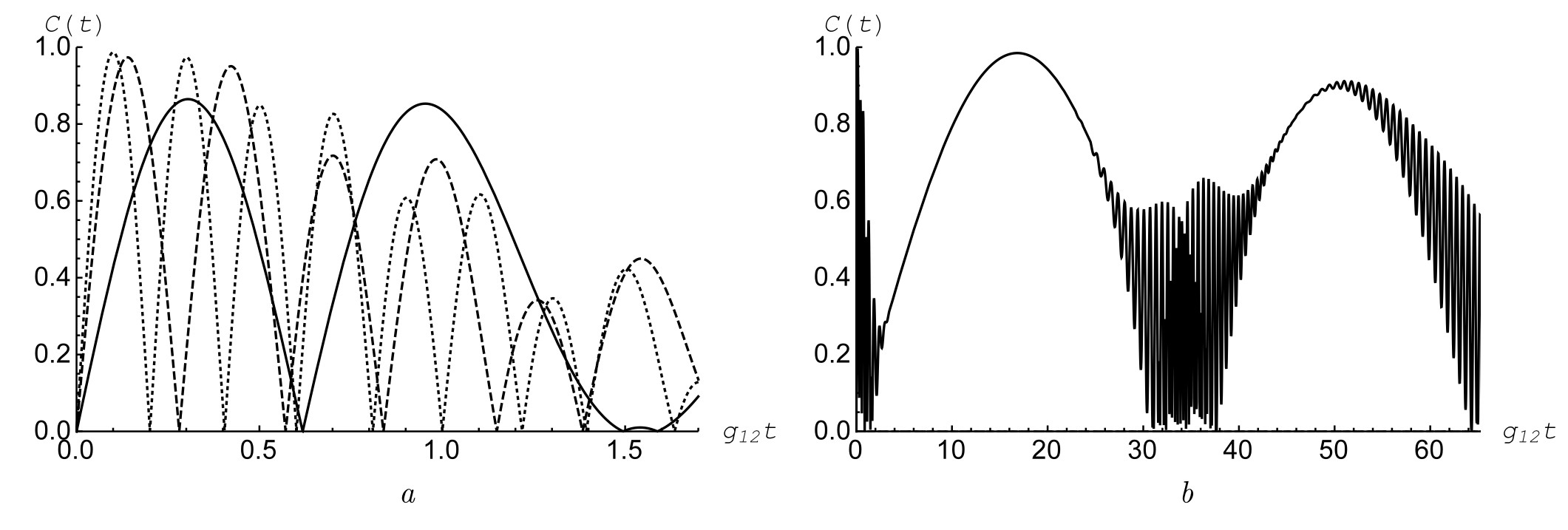 Рис. 2. Зависимость согласованности C(t) от приведенного времени g12t для перепутанного начального состояния кубитов 1/√2(|+, +⟩ + |−, −⟩) и когерентного состояния микроволнового поля. Случай (a) соответствует коротким приведенным временам. Среднее число фотонов ̅n = 30. Параметр ϕ = 0 (сплошная линия), ϕ = π/4 (штриховая линия) и ϕ = π/2 (точечная линия). Случай (b) соответствует длинным приведенным временам. Среднее число фотонов ̅n = 10 (сплошная линия), ̅n = 30 (штриховая линия) и ̅n = 60 (точечная линия)