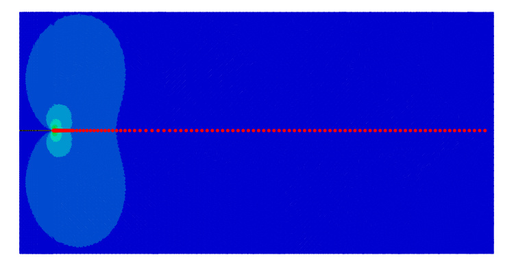 Функционал созданной пользовательской подпрограммы UMAT, описывающей поведение материала в условиях ползучести и верифицированной проверочными расчетами, был расширен с помощью введения соотношений, учитывающих процесс накопления повреждений (1.3). В результате выполненных серий расчетов исследованы поля эквивалентных напряжений в окрестности вершины трещины в условиях ползучести. На рис. 3.1 изображен путь, вдоль которого приведены распределения компоненты тензора напряжений , длина которого равна 1.05 мм.