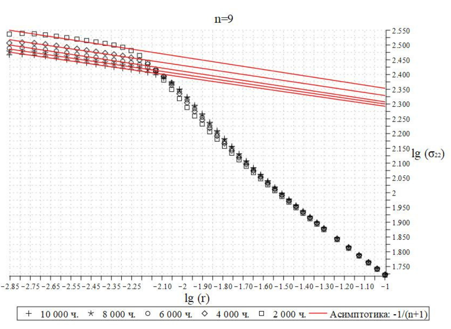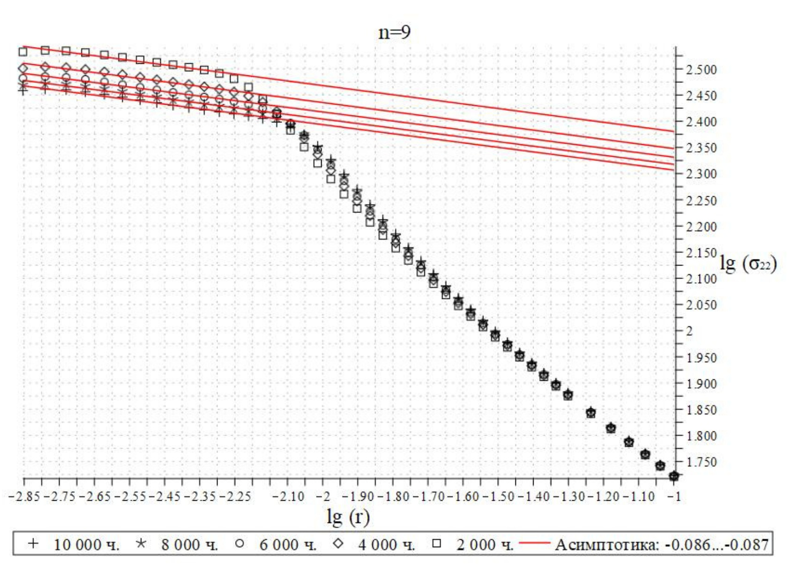 Рис. 3.7. Расчет без учета эффекта накопления повреждений для n=9: распределение компоненты тензора напряжений σ22 для выбранных расчетных точек. Асимптотика в зоне упругости
