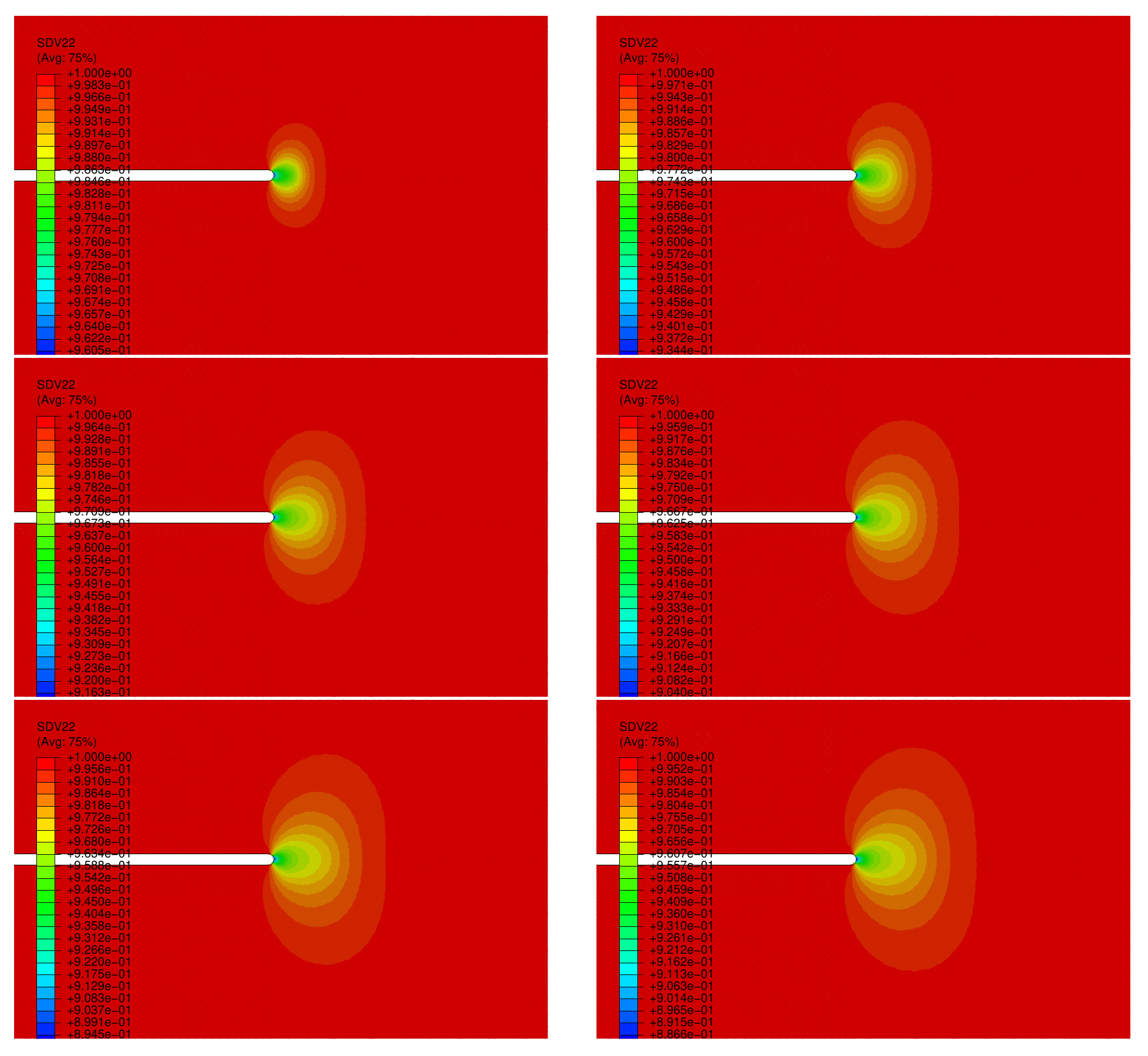 Рассмотрев поведение полей напряжений у вершины трещины, стоит перейти к анализу введенной величины — сплошности. На рис. 3.9 показаны картины распределения параметра сплошности материала с постоянной по пути, указанном на рис. 3.1 с течением времени.