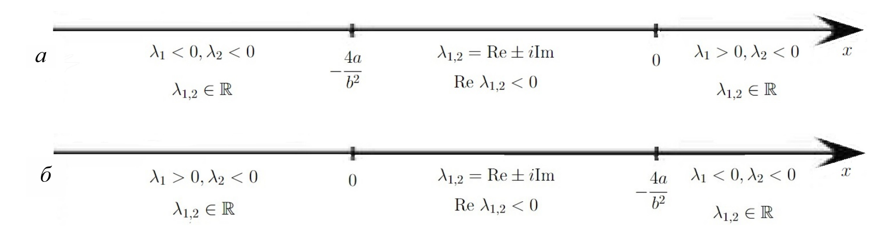 В случае и анализ собственных чисел проводится аналогично. Здесь при собственные значения будут вещественными разных знаков, при — комплексно сопряженными с отрицательной вещественной частью, а при собственные значения будут отрицательными вещественными, см. рис. 1. Отметим, что в случае и изменения в характере собственных чисел происходят аналогичным образом, но при уменьшении .