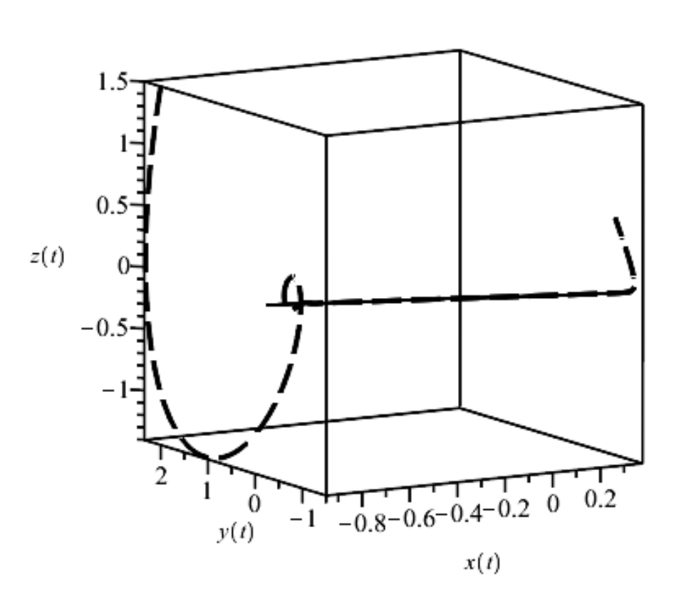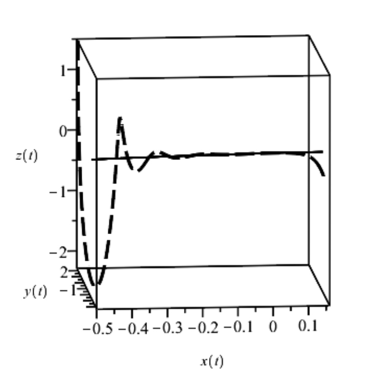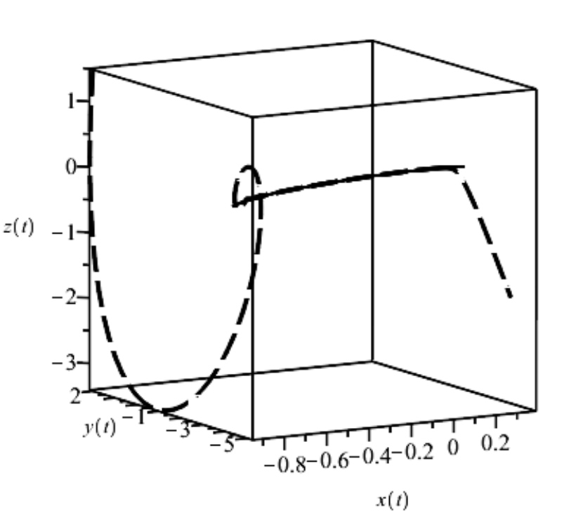 Рис. 5. Глобальное медленное инвариантное многообразие со сменой устойчивости (8) (сплошная линия) и траектория системы (7) с начальным условием x(0) = -0,95; y(0) = 2; z(0) = 1,5 (пунктирная линия); a = 1; b = 1; α0 = 1,5; α1 = 1,2; α2 = 1.1; α3 = -1; α4 = 2,1; α5 = 1,5; ε = 0.01