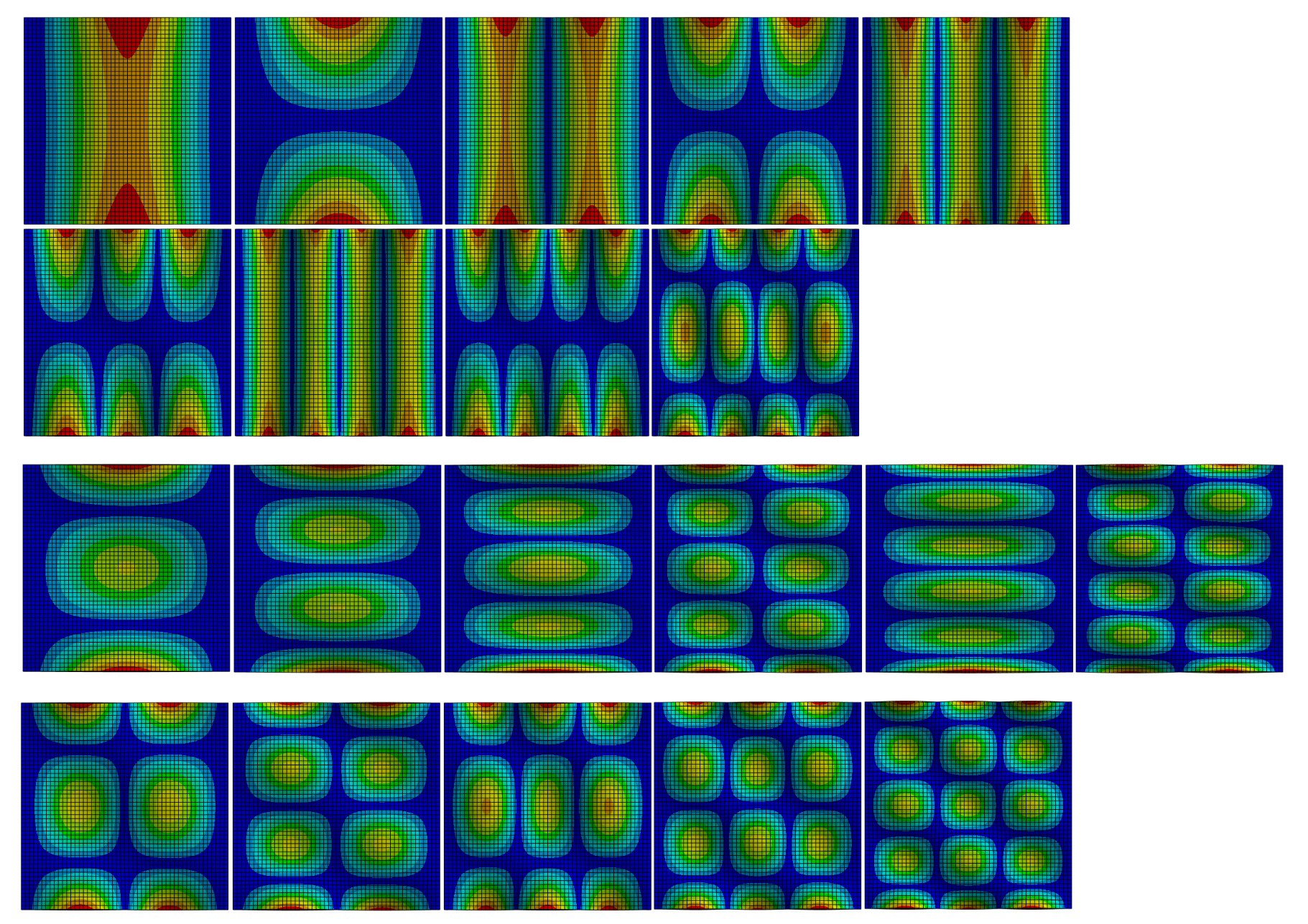 При условии жесткого закрепления пластины по всему контуру изменение температуры на 10 °С, приводит к появлению в пластине напряжения МПа, что, в свою очередь, ведет к возникновению сжимающих продольных сил , . Наличие сжимающих сил уменьшает частоту собственных колебаний, что хорошо видно по результатам аналитического расчета и моделирования.