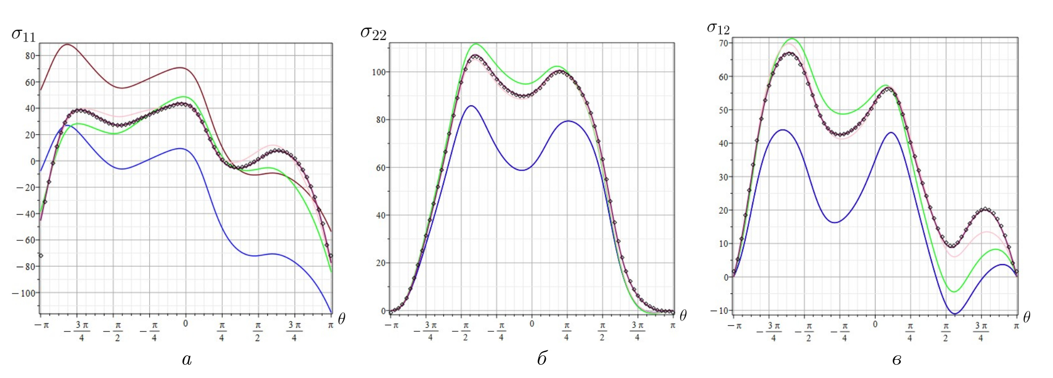 Рис. 3.2. Угловые распределения компонент тензора напряжений для углов α=90°, β=0°: а — σ11, б — σ22, в — σ12