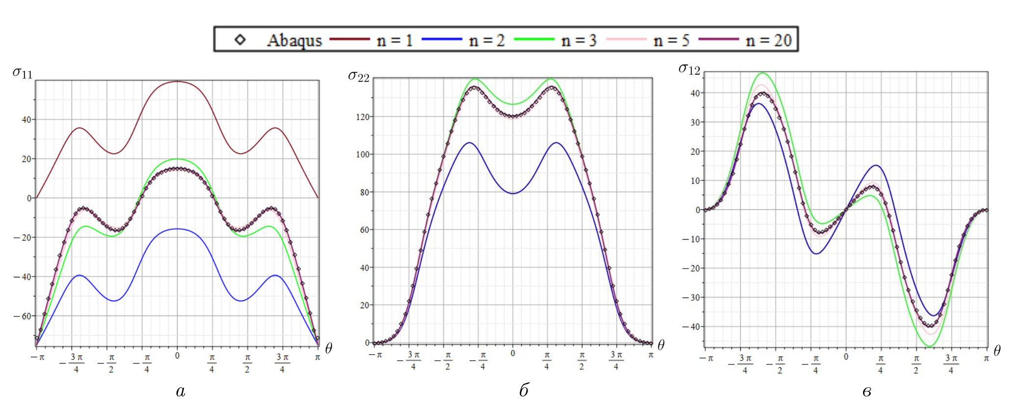 В качестве тестового образца была выбрана квадратная пластина, длина стороны которой была много больше длины трещины. Результаты расчета алгоритма переопределенного метода сопоставлялись с аналитическим решением задачи о растяжении бесконечной плоскости с математическим разрезом. Результаты сравнения конечно-элементного решения и аналитическиого решения для большой пластины с малым дефектом приведены на рис. 3.2–3.5. Сплошными линиями изображены угловые распределения компонент тензора напряжений, определенные в соответствии с аналитическим решением задачи при сохранении различного числа слагаемых в разложении. Точками показаны результаты конечно-элементного анализа. Из представленных графиков следует, что конечно-элементное решение полностью совпадает с асимптотическим решением с коэффициентами ряда, найденными с помощью переопределенного метода. Таким образом, можно заключить, что переопределенный метод, основанный на конечно-элементном анализе напряженного состояния, позволяет с хорошей точностью воспроизвести коэффициенты обобщенного ряда и дать асимптотическое представление напряжений.