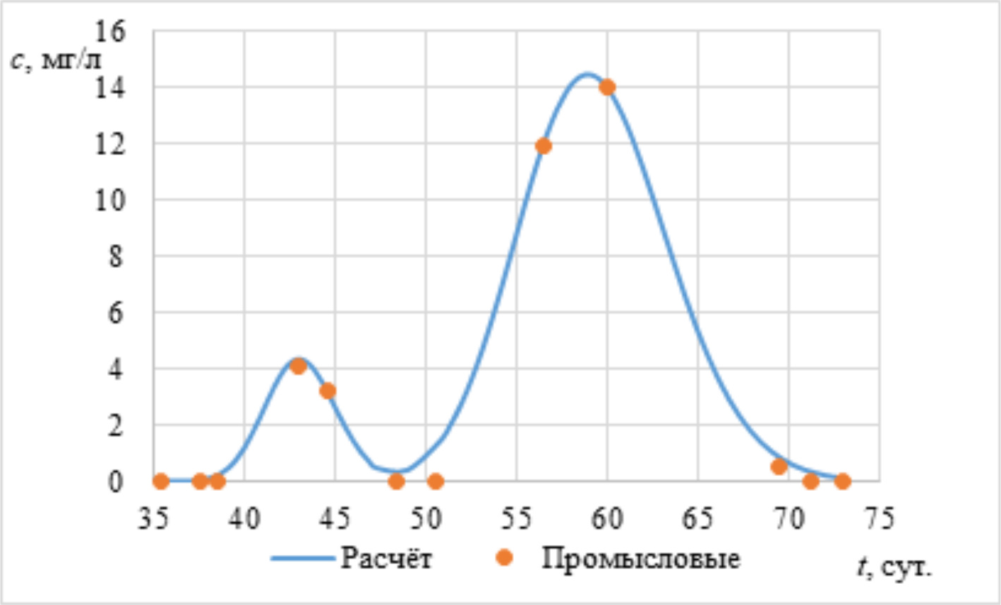 Валидация расчетных значений концентрации трассера с учетом определения коэффициента диссипации по методу градиентного спуска показала хорошее согласование с промысловыми данными (среднеквадратичные отклонения не превышают 7 %).