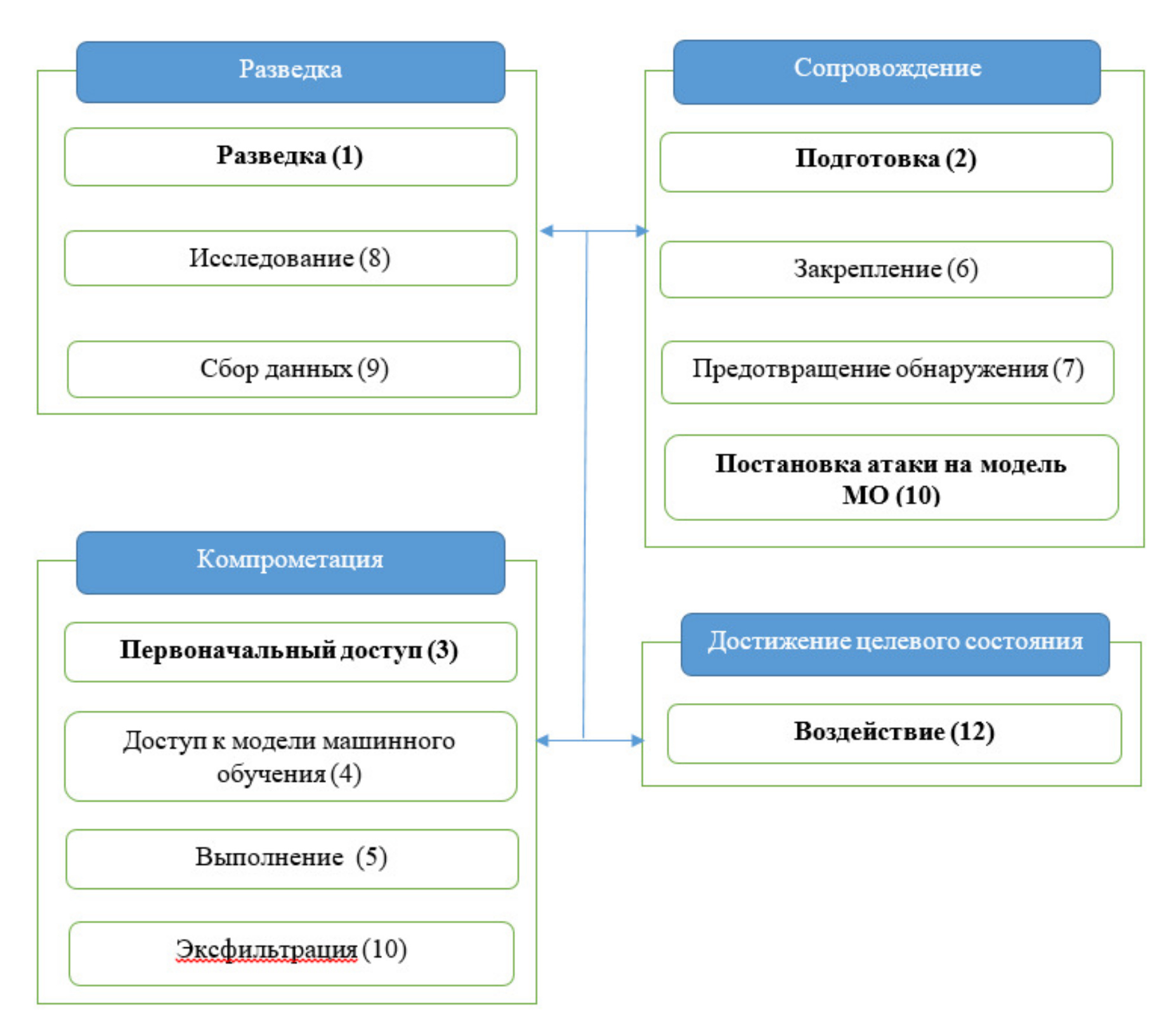 Для построения сценария атак подобного рода часто используют методологию MITRE ATLAS (далее MITRE) [4; 10]. На рисунке 2 приведена упрощенная (абстрагированная) классификация тактик MITRE, в которой тактики объединены на основе сходства функционального назначения техник в несколько классов, а именно: