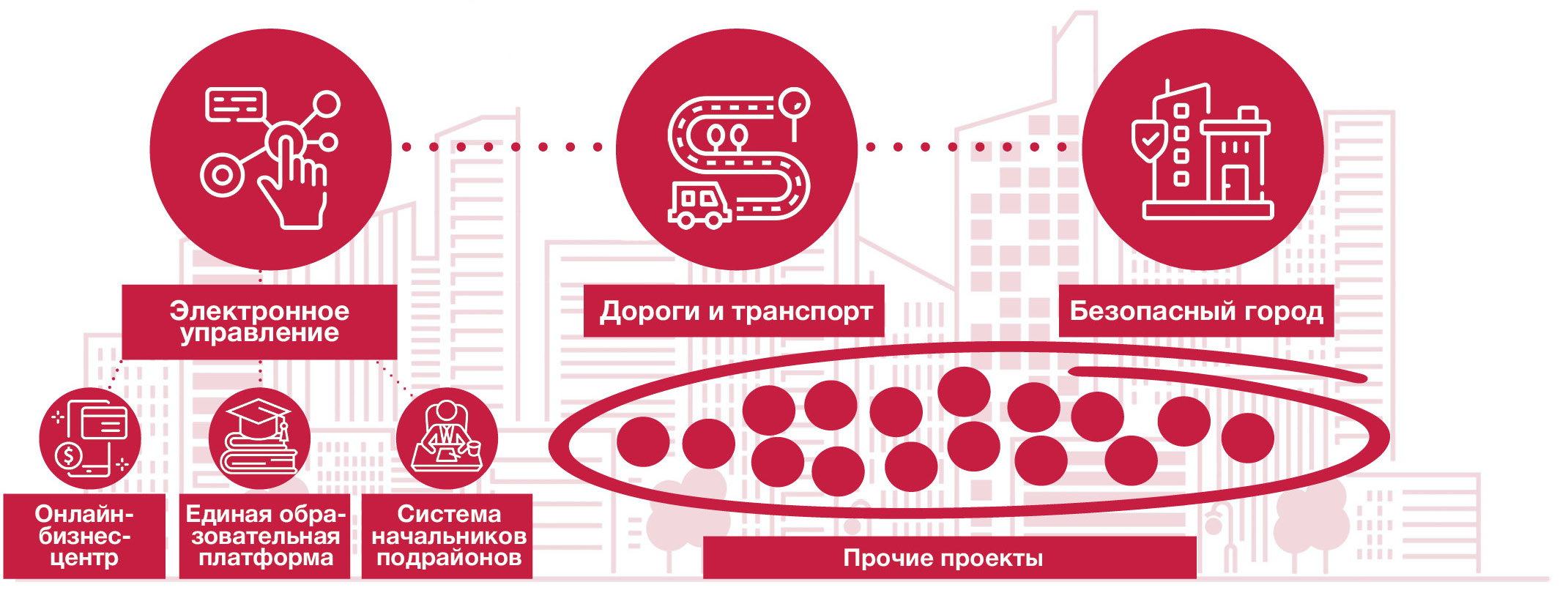 В рамках проекта «Цифровой город» технологические решения внедряются в несколько отраслей городского хозяйства. Проект включает три направления (рис. 1): «Электронное управление», «Дороги и транспорт», «Безопасный город» и разделен на 16 подпроектов (проектов второго уровня), объединенных пятью целями: