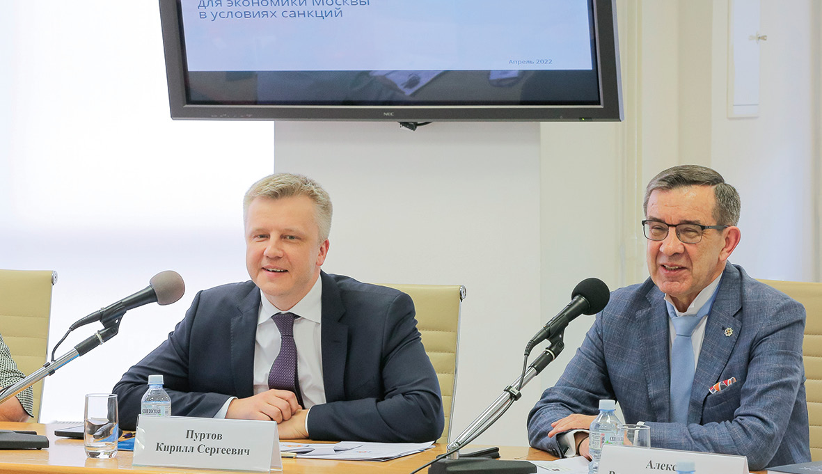 Руководитель Департамента города Москвы по конкурентной политике К. С. Пуртов (слева) и профессор В. Н. Алексеев на конференции о финансовых рисках в Университете Правительства Москвы (фото А. Красавина)