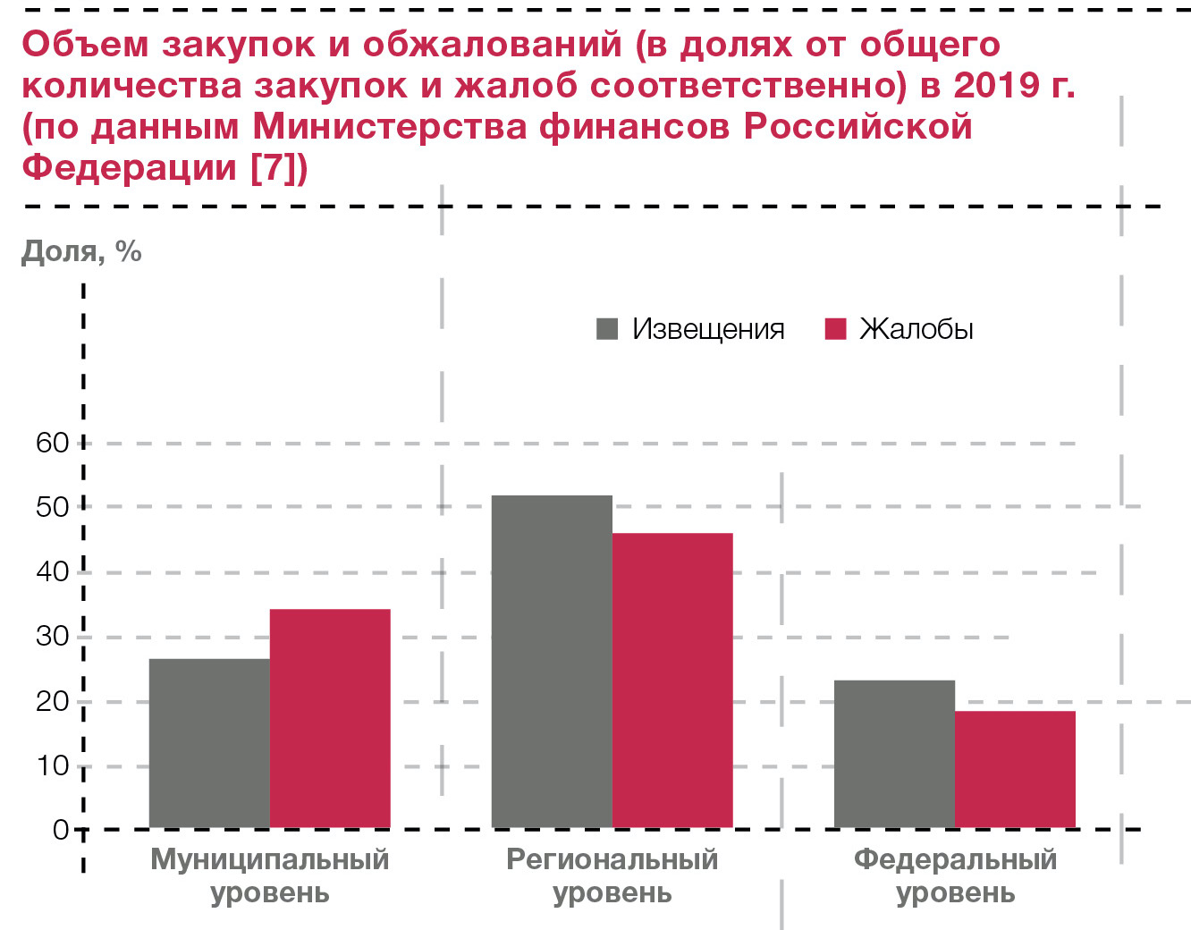 Объем закупок и обжалований (в долях от общего количества закупок и жалоб соответственно) в 2019 г. (по данным Министерства финансов Российской Федерации [7])