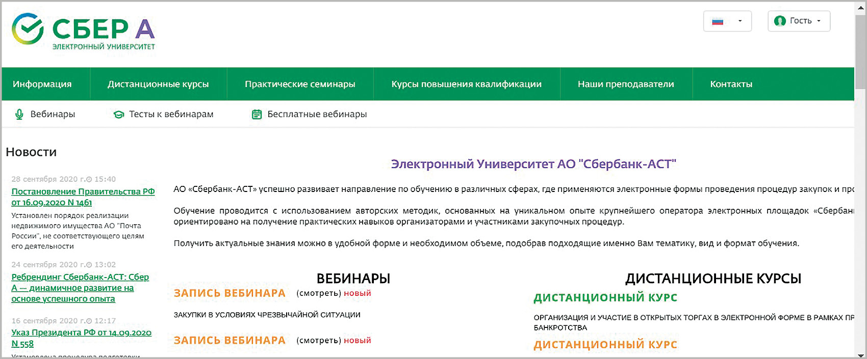 Скриншот главной страницы Электронного университета «Сбер А» (https://univer.sberbank-ast.ru)