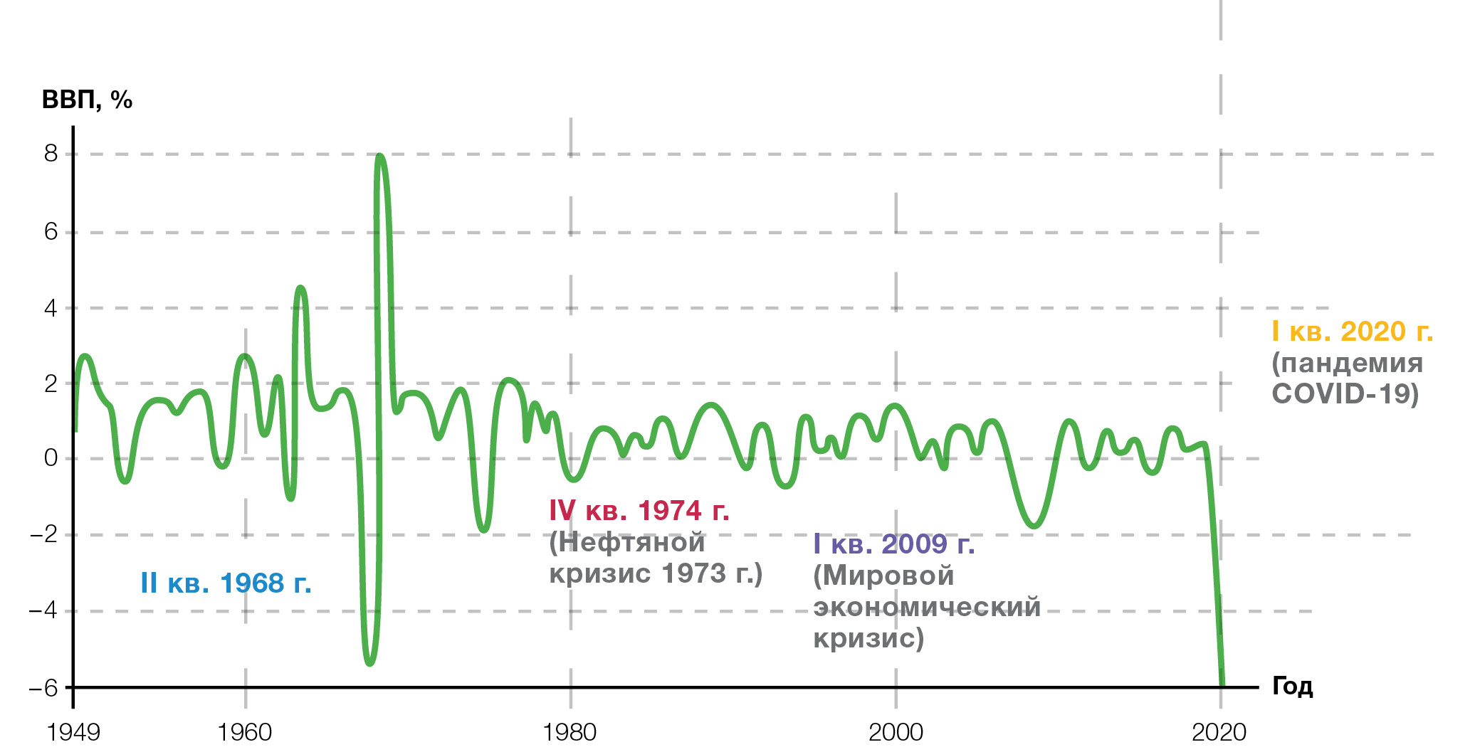 Рис. 1. Квартальный рост ВВП Франции в 1949–2020 гг. (источник: Insee, www.insee.fr)