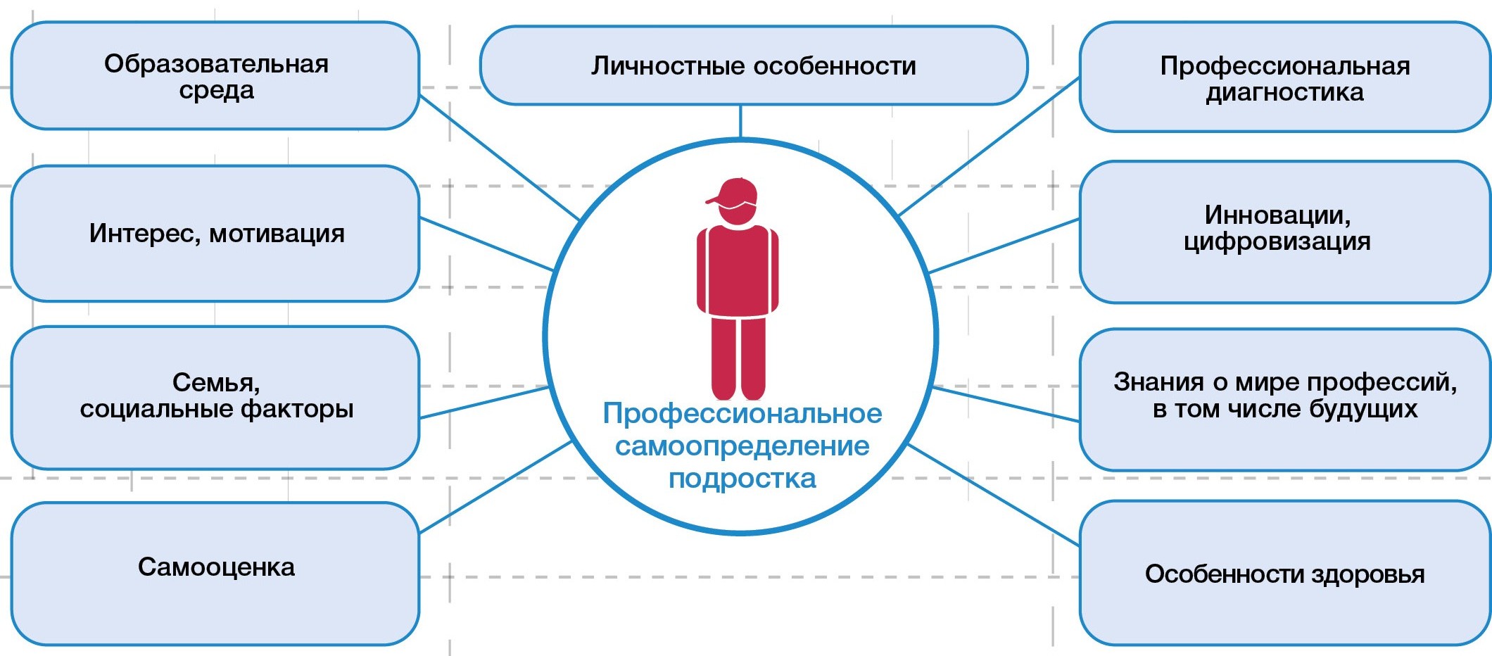 Помимо реабилитационных и образовательных задач, стоящих перед мультидисциплинарной командой учреждения, немаловажна и проблема профессионального самоопределения подростков. Результаты исследования WorldSkills Russia демонстрируют, что свыше 70% молодых людей не знают, какой профессиональной деятельностью они хотели бы заниматься [4]. Очевидно, что профориентационная работа требует системного подхода. Сущность профессионального самоопределения можно описать как «поиск и нахождение личностного смысла в выбираемой, осваиваемой и уже выполняемой трудовой деятельности, а также нахождение смысла в самом процессе самоопределения» [7].