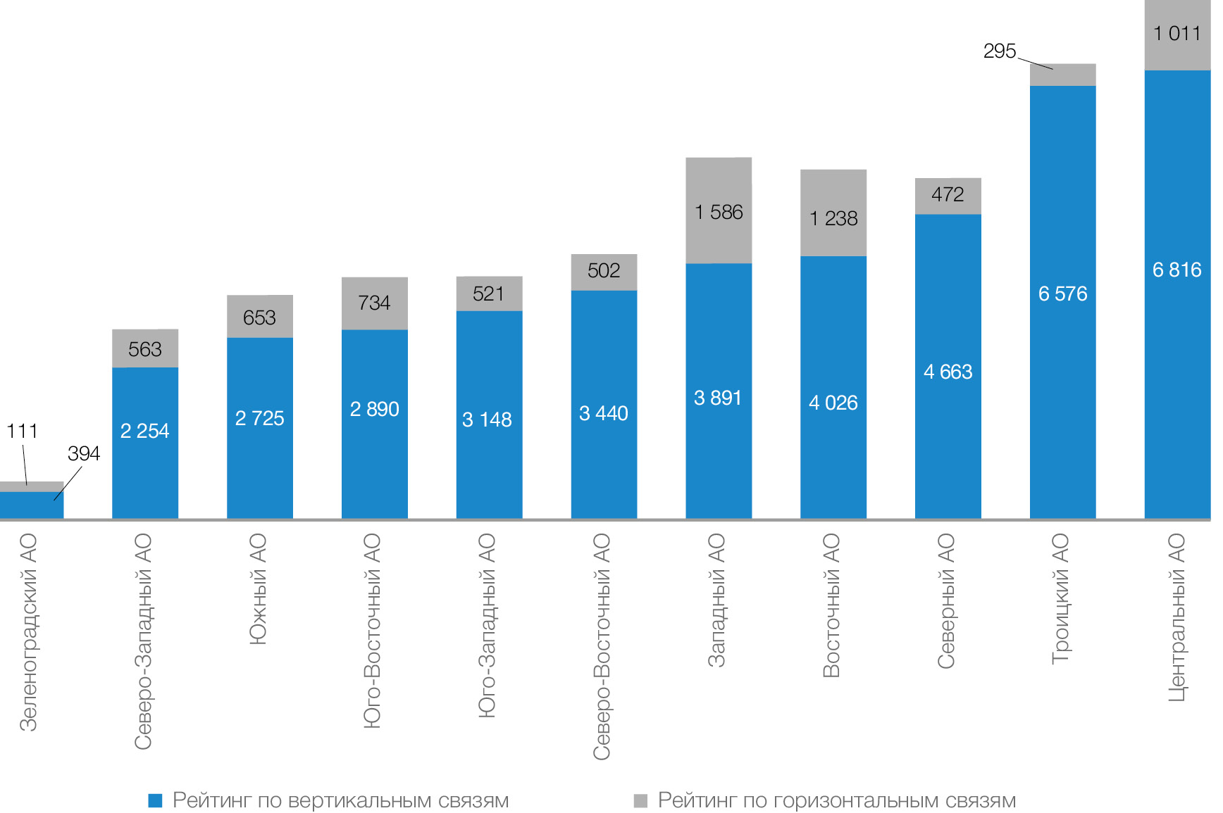 Поскольку влияние управляющих компаний через горизонтальные связи незначительно, допустимо начать формирование рейтинга административных округов с учета вертикальных связей. При оценке можно следовать в одном из двух направлений:
