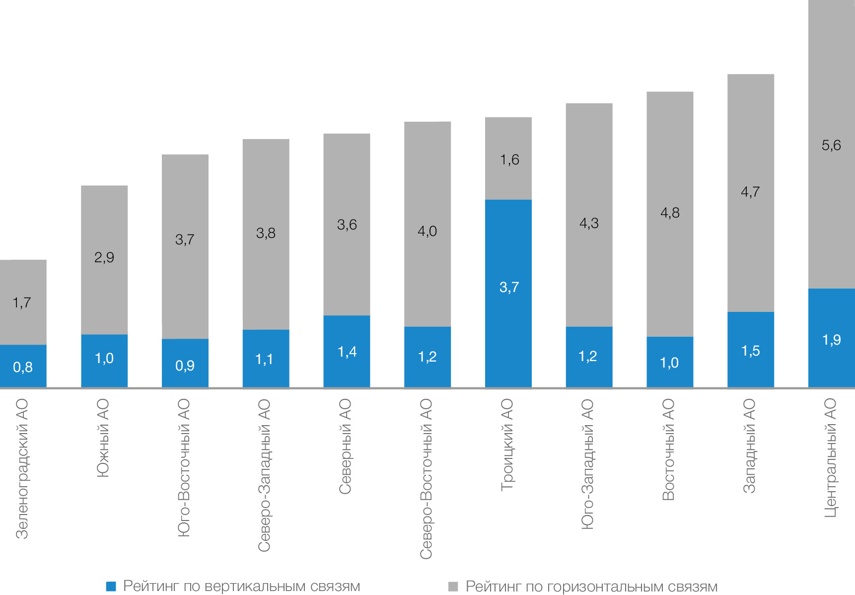 В Центральном административном округе в среднем на один МКД приходится 7,5 балла рейтинга округа (см. рис. 7), а на каждые 10 тыс. кв. м площади – 6,7 балла общего рейтинга округа (см. рис. 8). Примечательно, что при пересчете показателя на один МКД существенно возрастает вклад горизонтальных связей в общую сумму баллов. Это происходит потому, что количество МКД, управляемых смежными компаниями, невелико при достаточно высоком суммарном балле рейтинга за счет управляющих компаний, делающих вклад по горизонтальным связям. Однако при оценке по удельному показателю в пересчете на единицу площади (рис. 8) наблюдается довольно равномерное распределение вкладов по горизонтальным и вертикальным связям. Исключение составляет Троицкий административный округ, в котором пропорция смещена в сторону вертикальных связей. Иначе говоря, больший вклад в формирование рейтинга по удельному показателю в пересчете на площадь приходится на управляющие компании, которые выполняют свои функции только в данном административном округе. Обнаруженный факт говорит о том, что в Троицком округе имеется возможность усилить горизонтальные связи, и это позволит выровнять вклады от вертикальных и горизонтальных связей.