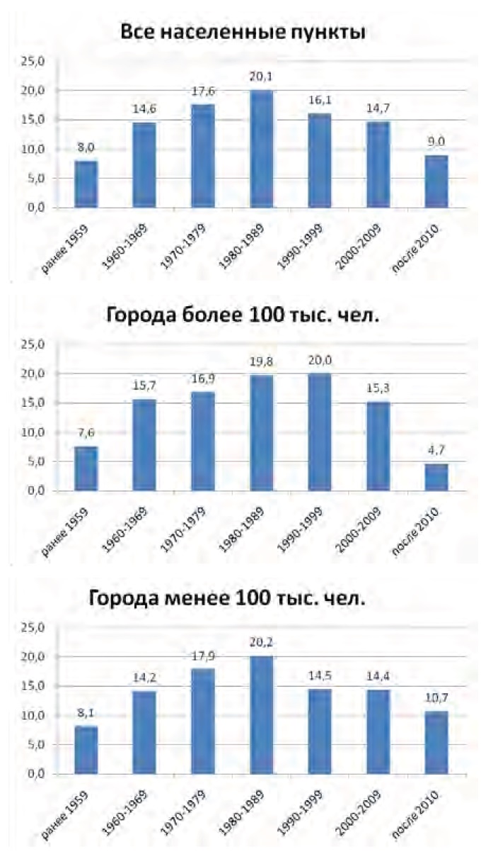 Анализ данных табл. 2 показывает, что даже в населенных пунктах с числом жителей до 100 тыс. чел. трубы из разных материалов применяются крайне неравномерно. В них имеются водопроводные сети, выполненные только из одного типа труб на 90–100 %. Это объясняется разными причинами. В малых населенных пунктах числом жителей до 10 тыс. чел. водопроводные сети строились разом на всей территории за относительно небольшой промежуток времени и в дальнейшем практически не подвергались ни расширению, ни реконструкции. В городах, расположенных на севере страны или в районах с высокой сейсмичностью, водопроводные сети представлены исключительно стальными трубами. При этом в Вологодской, Ивановской областях, в Республике Татарстан тоже есть города, в которых доля стальных труб достигает 85–90 %. В крупных населенных пунктах присутствуют трубы из всех материалов.