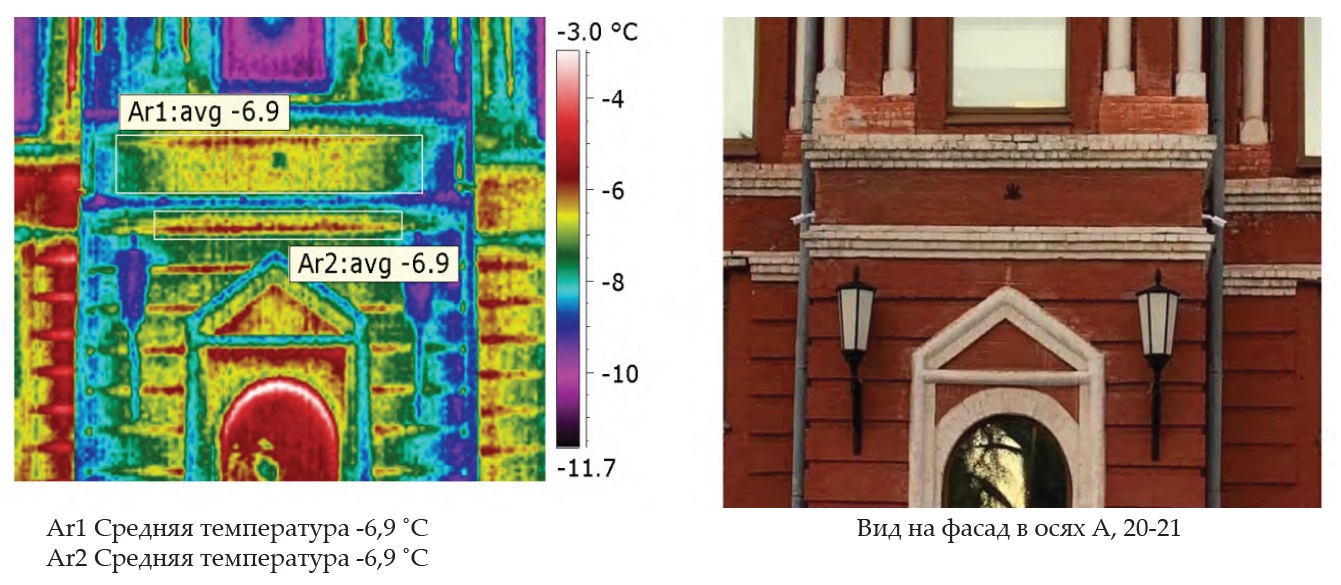 Перед выполнением проектных работ было произведено тепловизионное обследование ограждающих конструкций эксплуатируемого здания с целью определения фактических значений сопротивления теплопередаче. Тепловизионное обследование проводилось в декабре 2020 г. с помощью тепловизионной камеры THERMA CAM В2 при температуре наружного воздуха tн = -10 °С. При проведении обследования руководствовались методикой, изложенной в ГОСТ Р.54852-2011, ГОСТ 31937-2011, и работой [10].