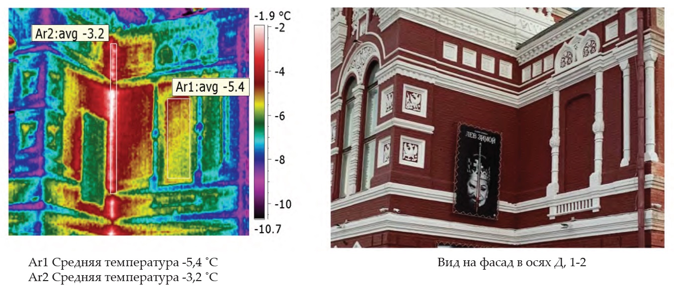 Preservation of the architectural appearance of buildings of historical and cultural heritage is a prerequisite for their energy modernization when performing major repairs or reconstruction. In this regard, it is not possible to use facade systems to reduce heat losses by external walls. The use of internal insulation, as construction practice has shown, quite often led to a violation of the humidity regime of enclosing structures and, as a result, to the formation of dark spots and mold fungi on the internal surfaces. To prevent moisture accumulation in enclosing structures, with internal insulation, only thermal insulation materials with a low coefficient of vapor permeability should be used. The article presents the results of a thermal imaging survey of the facades of the Samara Academic Drama Theater building, which indicate increased heat loss in the basement of the building and the exterior walls made of silicate bricks after reconstruction in 1967. In order to meet modern regulatory requirements for the thermal protection of buildings of historical and cultural heritage, it was proposed to additionally insulate the exterior walls from the inside above the zero mark with foam glass, as well as warm plaster – in the basement and basement of the building. Solutions are proposed for the replacement of window structures, entrance doors, coverings and ceilings to increase the energy efficiency of the operated building. When performing the thermophysical calculation of the above-listed enclosing structures, the author’s methodology for estimating the plane of possible condensation was applied, which allows for a higher probability of assessing moisture accumulation in them.