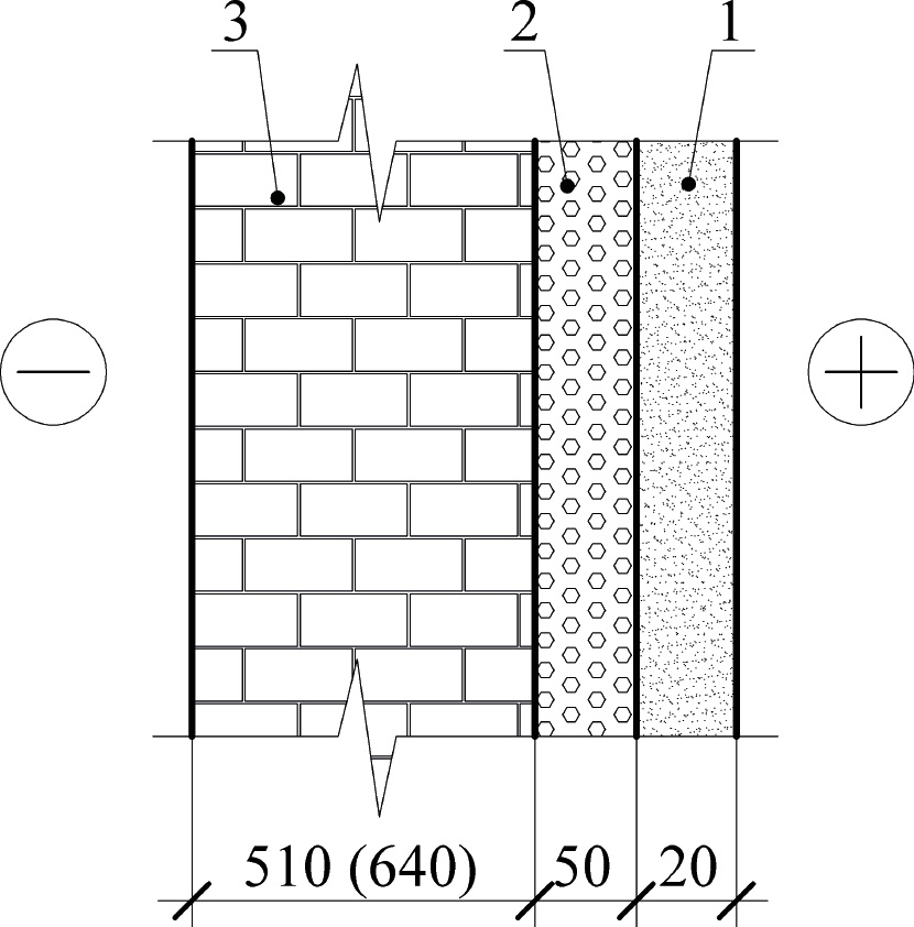 Для повышения теплозащитных характеристик указанных выше стен рекомендуется их утеплить плитами из пеностекла толщиной 0,05 м, защищенными со стороны утепления цементно-песчаной штукатуркой толщиной 0,02 м. На рис. 4 представлен фрагмент утепленной наружной стены. Состав наружной стены показан в таблице.