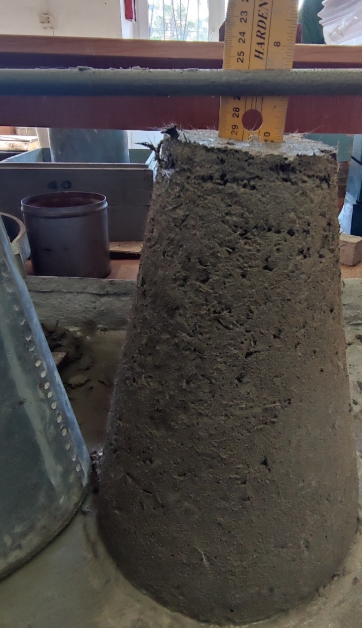 Экспериментальным путем были подобраны составы с подвижностью П1 (ОК 1 – 4 см) по ГОСТ 10181. При этом, так как смесь мелкозернистого бетона с добавлением фибры можно рассматривать как разновидность специального раствора (для проведения ремонтных работ), также проводились испытания по определению подвижности по величине погружения стандартного конуса по ГОСТ 5802 (рис. 5). В результате пробных замесов бетонной смеси было установлено, что при получении показателя осадки конуса 1 – 4 см значение погружения конуса было в диапазоне 3 – 4 см.