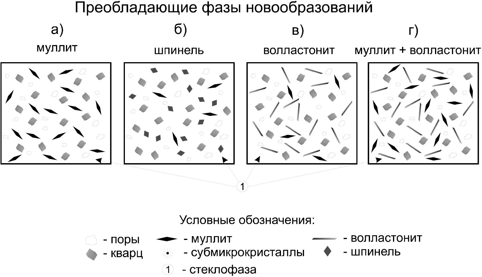 Повышение прочности может быть достигнуто на гомогенных шихтах за счет оптимизации структуры и фазового состава путем направленного синтеза кристаллических новообразований (муллита, шпинели, волластонита, а также твердых растворов) и каталитической кристаллизации эвтектического алюмосиликатного расплава [5].