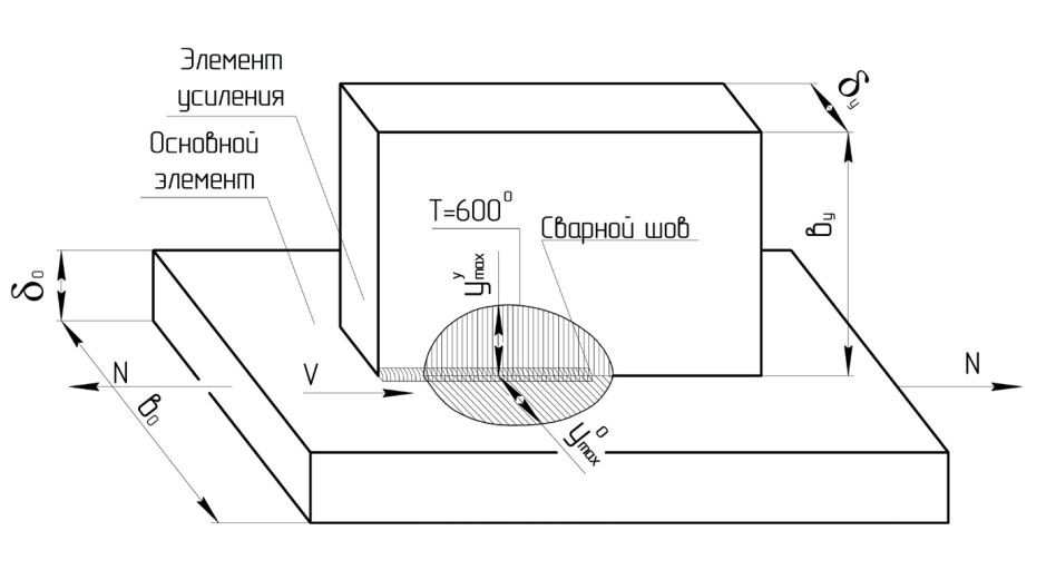 Как видно из выражения (6), величина Ymax зависит от погонной энергии сварки и толщины элемента, что позволяет сделать вывод о принципиальной возможности регулирования «пятна» ослабления путём варьирования технологическими параметрами сварочного процесса.