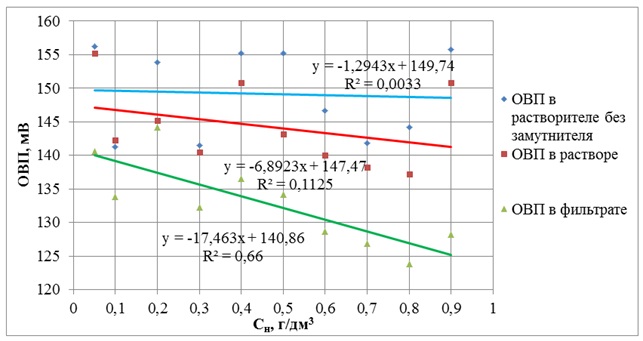 Из анализа данных, приведенных на рис. 4 и 5, было установлено, что в исследуемом диапазоне изменения параметров значения ОВП находились в обратно пропорциональной зависимости от увеличения концентрации замутнителя Cн. Причем интенсивность снижения значения ОВП(JОВП) на единицу увеличения концентрации замутнителя Cн составляла, мВ/(г/дм3):