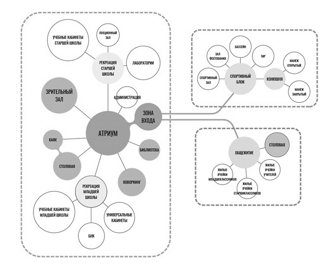 В спортивной школе по современному пятиборью происходит подготовка по всем видам дисциплин, входящих в программу. Для их освоения необходимы такие площадки, как: беговая дорожка для дистанции в 3 км, манеж для конкура площадью 2500 м2, маршрут должен быть протяженностью в 350−450 м и состоять из 12 препятствий, бассейн не менее 25 м для дистанции 200 м, зал для фехтования, стрелковый тир. Для данных целей на объекте должен быть отдельный спортивный блок с бассейном, тиром для стрельбы, залом для фехтования и большим спортивным залом, а также конно-спортивный корпус на 10 лошадей с закрытым и открытым манежем. На основании функционального анализа были выявлены следующие неотъемлемые элементы внутренней структуры: атриумы, огород на крыше, технические помещения в подземном уровне здания, помещения для временного или постоянного проживания (общежитие), помещения учебного блока. В объемно-планировочном решении спортивные школы – это здания переменной этажности, но не более пяти этажей. В подземном уровне комплекса могут размещаться тир и технические помещения. На первом этаже в основном располагаются входная группа, помещения кухни, столовой, общежитие, учебные блоки, спортивный зал и бассейн, помещения обслуживания. Второй этаж включает в себя в основном учебные помещения, рекреационные зоны, форум, зрительный зал. На последующих этажах расположены учебные помещения. На основе современных примеров проектирования выявлены основные функциональные блоки: вестибюльная группа, помещения спортивного блока, общежитие, помещения пищеблока, учебные помещения для младшей, средней и старшей школы, общешкольные помещения, административные помещения, а также помещения конюшни (рис. 6).