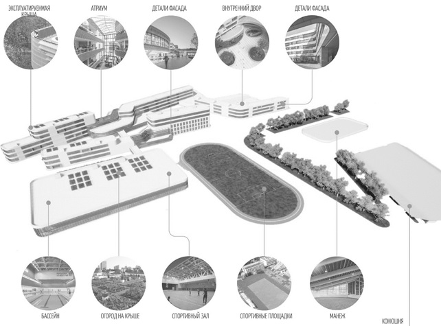 Комбинаторика образовательных, спортивных функций, а также условий для временного проживания спортсменов, тренеров и учителей позволяет повысить уровень спортивной подготовки будущих чемпионов без отрыва от получения общего образования. Помимо основного блока школы на участке, как упоминалось ранее, должен находиться денник для лошадей, манеж и открытый стадион. Блочная структура основного здания позволяет минимально использовать площадь участка, разгруппированные выходы используются для доступа к объектам спортивной инфраструктуры по кратчайшему пути взаимодействия. Также в современных проектах нельзя не уделять внимания принципам бережливого и энергосберегающего потребления энергии и ресурсов окружающей среды. В объектах спортивных школ могут быть устроены огороды на эксплуатируемых кровлях, фасады с фотохроматическими элементами, энергосберегающее остекление и т. д. (рис. 7).