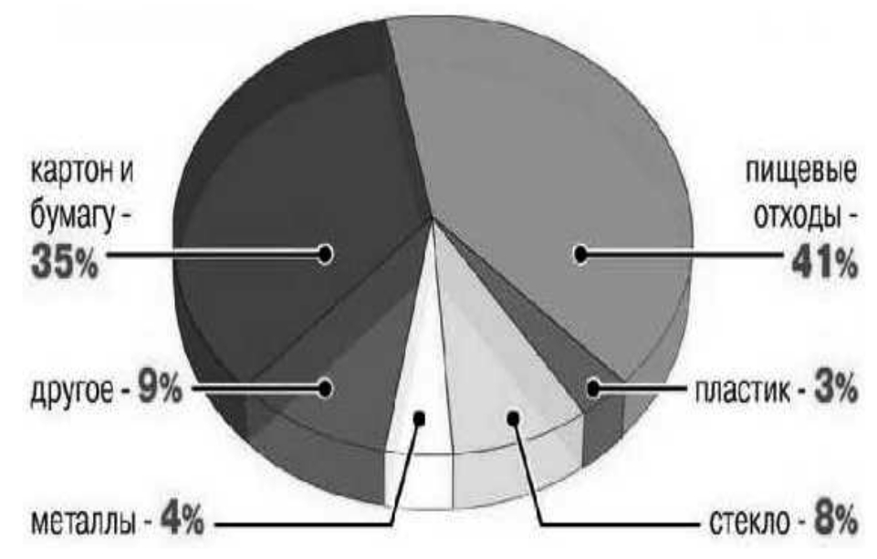 Анализ состава твердых бытовых отходов (ТБО), представленный на рис. 2, показывает, что целый ряд компонентов ТБО является ценным вторичным сырьем и может быть повторно использован.