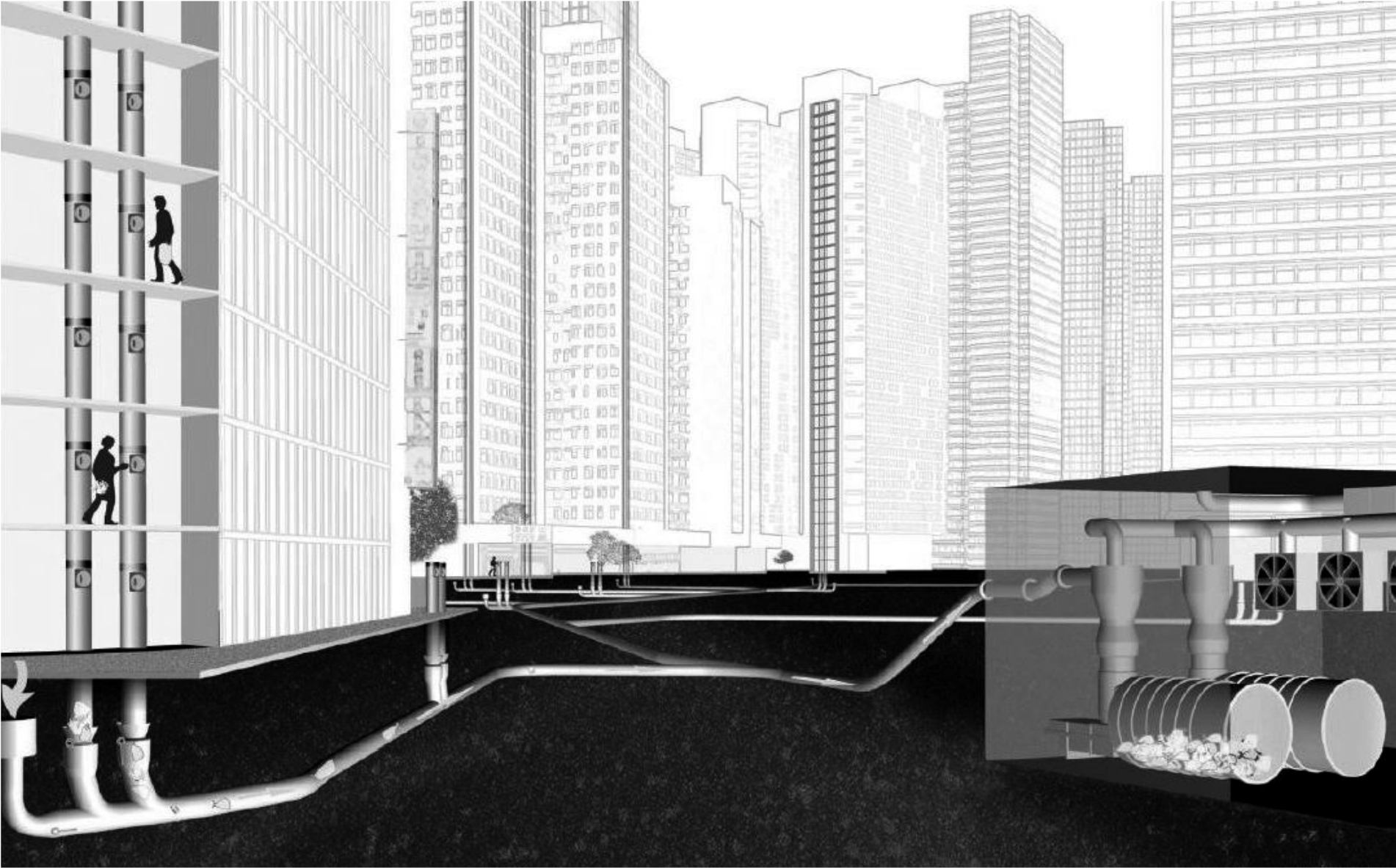 Вакуумные системы. Современным высокотехнологичным решением для сбора твердых бытовых отходов зданий или жилых комплексов являются системы вакуумного мусороудаления (рис. 3) [15]. Принцип работы такого устройства следующий. Это плотная пластиковая труба, имеющая несколько ответвлений, из которой отходы попадают в сеть подземных герметичных труб из углеродистой стали диаметром 0,5 м. По ним, посредством создаваемого насосом вакуума, отходы транспортируются в специальный коллектор со скоростью 70 км/ч. Коллектор представляет собой большой резервуар, в котором мусор обеззараживается и прессуется, за счёт чего он уменьшается в объёме почти в 20 раз. При необходимости происходит сепарация по нескольким видам отходов. Затем мусор вывозится грузовыми машинами на мусороперерабатывающий завод. Недостатком этой системы является ее стоимость – около 500 млн руб. на 10 тыс. квартир. Срок окупаемости системы – 30 лет. Преимуществом является отсутствие необходимости ежедневного обслуживания сотни мусорных баков.