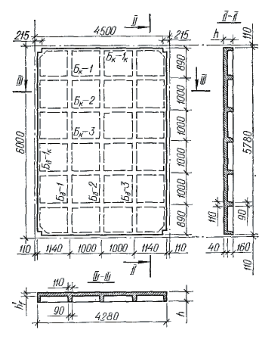 Рис. 1. Кессонная панель перекрытия [18, рис. 11.19]: Бд-1, Бд-2, Бк-1, Бк-2, Бк-3 – рассчитываемые балки