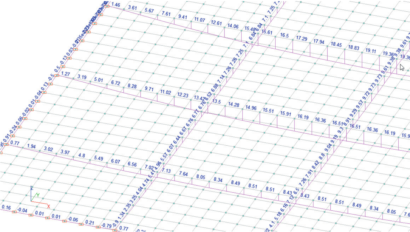 Для удобства создания компьютерной модели равномерно-распределенную нагрузку, действующую на перекрытие, прикладываем к балкам через гибкую плиту с условными физическими характеристиками(четырехугольный конечный элемент с промежуточными узлами № 50 КЭ), работающую по биссектрисной схеме излома [25].Шаг разбиения «густой»[4, с.82], вдоль оси X (короткая сторона)– 34 элемента, вдоль оси Y (длинная сторона)– 46 элементов. Подобный подход при моделировании фасадных конструкций со стеклопакетами с приложением нагрузки на пластины без жесткости в САПР APMWinMachineописан в работе [22, с. 166].
