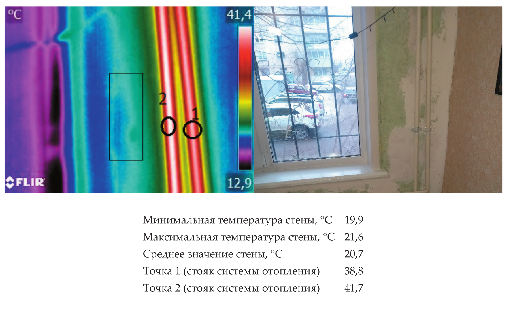 Из полученных результатов видно, что температуры на внутренней поверхности стены, полученные с помощью тепловизионной съемки, отличаются от значений, полученных с помощью измерителя теплового потока ИТП–МГ4.03/5(1), на величину погрешности измерения и практически совпадают, что свидетельствует о точности полученных результатов.