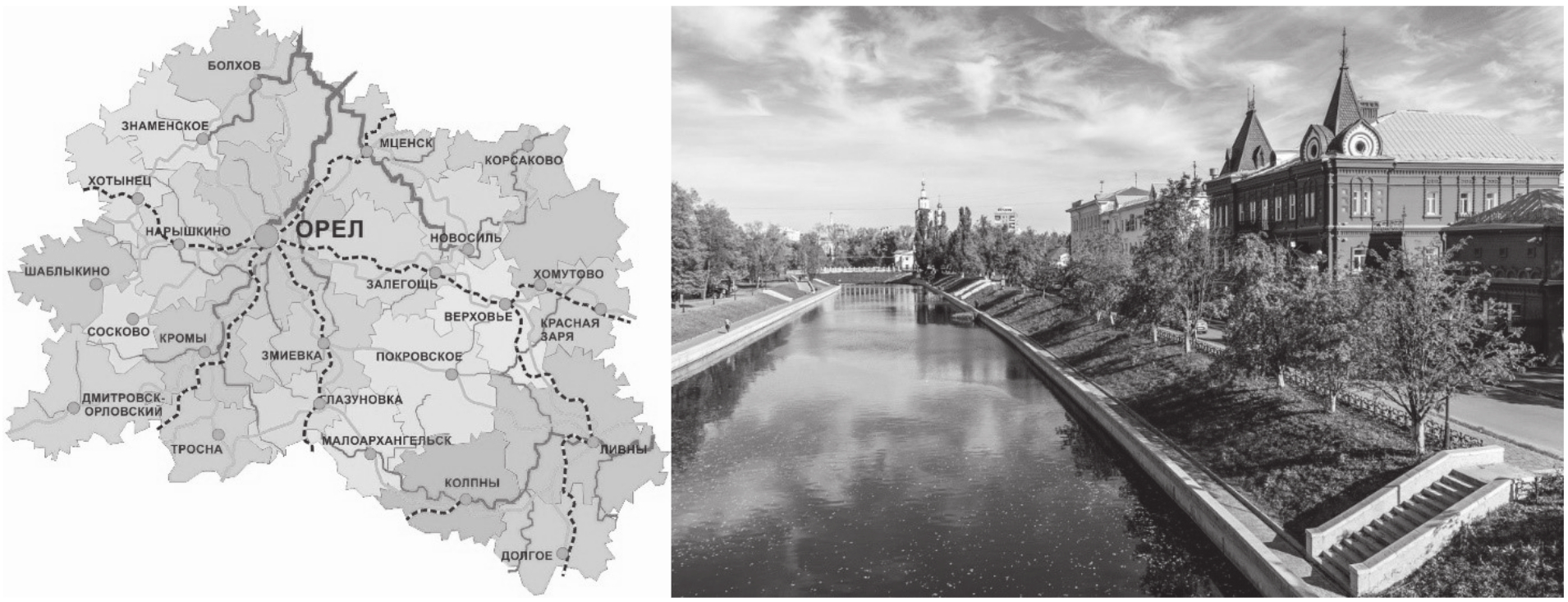 Рис. 2. Карта Орловской области и фото областного центра (г. Орел). Источник: https://haveall.net/karty-gorodov-orlovskoj-oblasti/ (дата обращения: 01.03.2023)