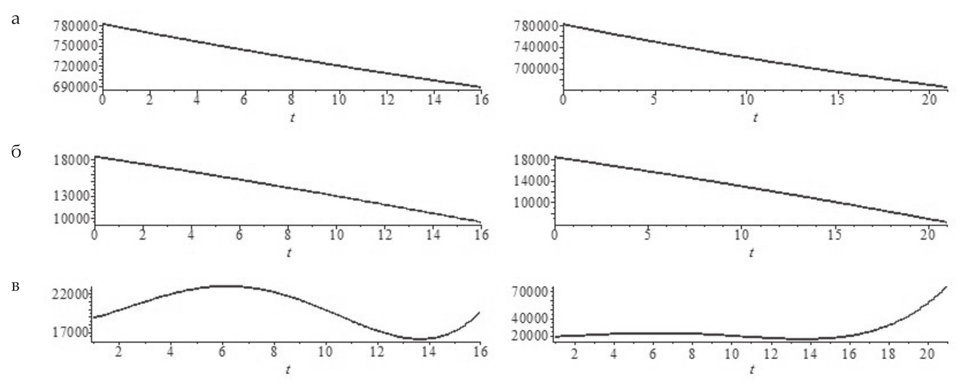 Рис. 7. Прогноз изменения демографических процессов Орловской области на промежутки времени 5 и 10 лет соответственно: а – прогноз изменения численности населения Орловской области; б – прогноз изменения числа прибывших в Орловскую область; в – прогноз изменения числа выбывших из Орловской области