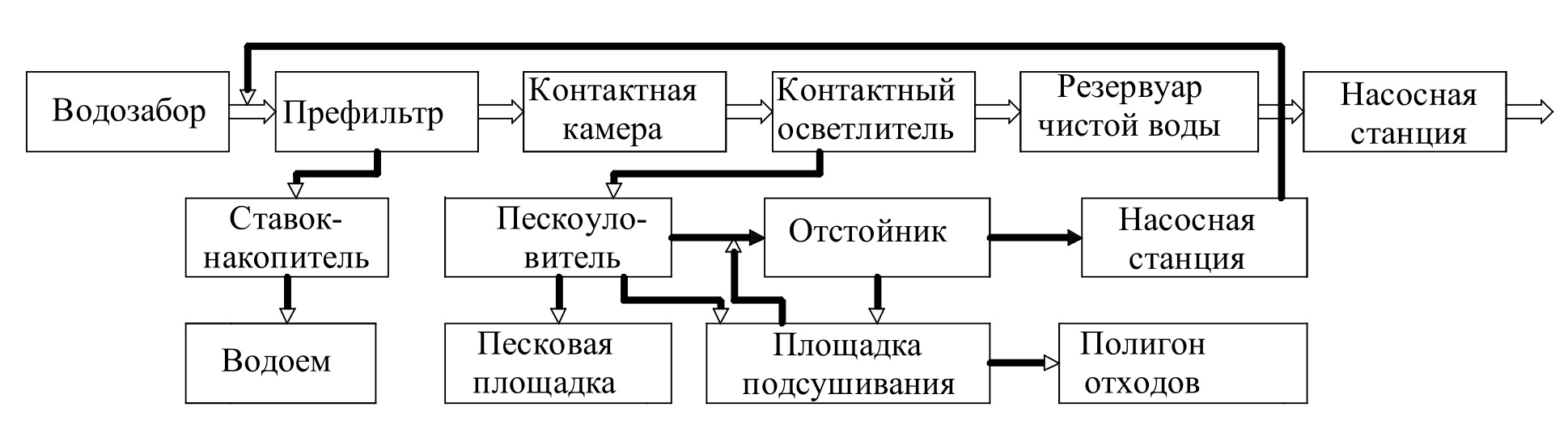 - первая схема (рис. 2) предусматривает направление промывной воды после контактных осветлителей в песколовки и отстойники, затем осветленную воду перекачивают в смесители ВОС, накопленный песок и осадок направляют на песковую площадку или на площадку подсушивания, а затем на полигон отходов;