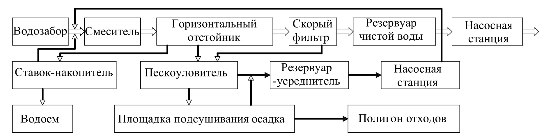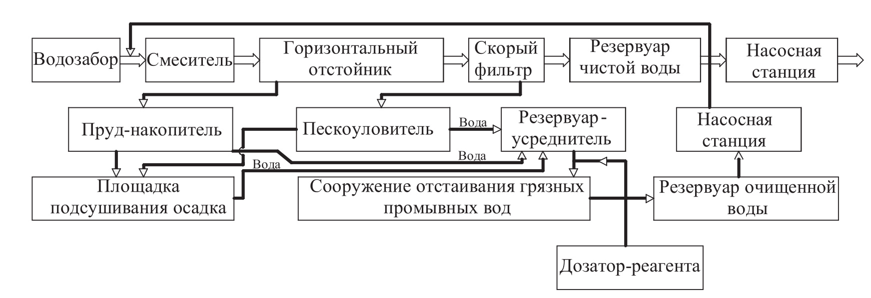 - по второй схеме (рис. 3) промывную воду после осветлителей со слоем взвешенного осадка и скорых фильтров, осадок из сооружения первой ступени направляют в сгустители, затем на площадки подсушивания и на полигон отходов. Осветленную воду из сгустителя перекачивают в смеситель или в пруды-накопители. Грязная промывная вода после резервуара-усреднителя поступает в смеситель ВОС;