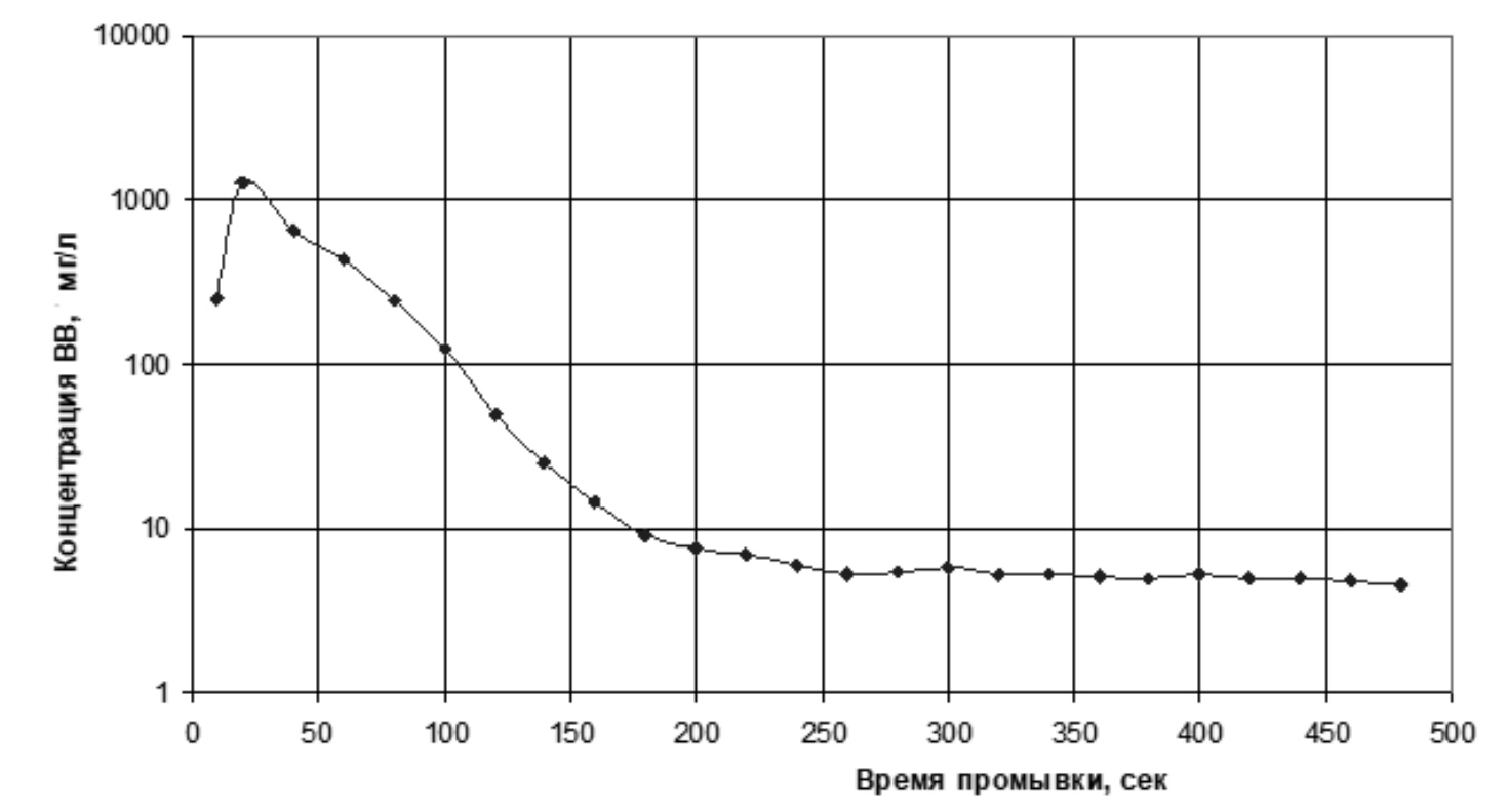 Рис. 5. Кинетика загрязненности в отобранных порциях – пробах промывных вод в течение периода промывки